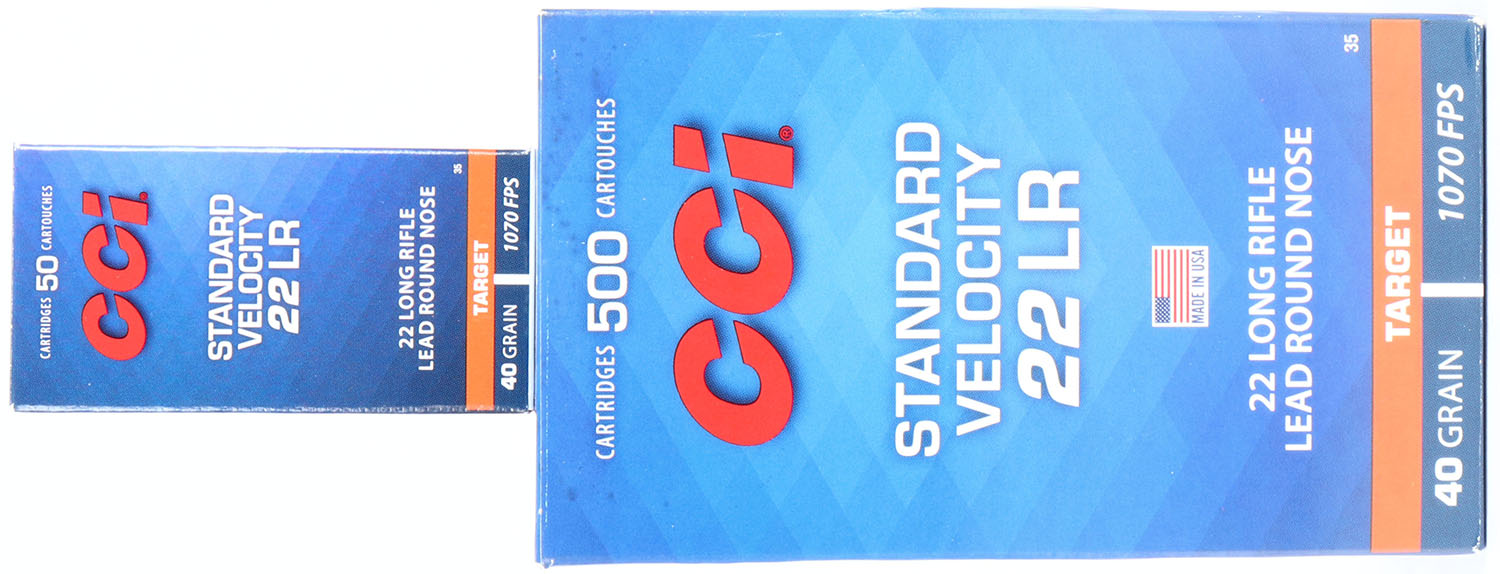 CCi, Standard Velocity, .22 Long Rifle, 40 Grain Lead Round Nose, 1070 FPS, Full 500rds., 1pc. Blue red & white brick, brick is MINT with mint color, corners are sharp, edges are crisp, end flaps are solid, inside boxes are mint. Grade: MINT - Value: 40 to 120