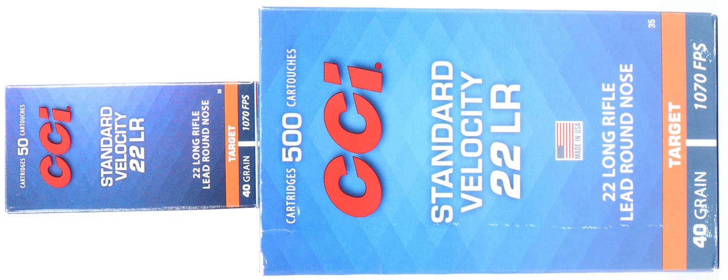 CCi, Standard Velocity, .22 Long Rifle, 40 Grain Lead Round Nose, 1070 FPS, Full 500rds., 1pc. Blue red & white brick, brick is MINT with mint color, corners are sharp, edges are crisp, end flaps are solid, inside boxes are mint. Grade: MINT - Value: 40 to 120