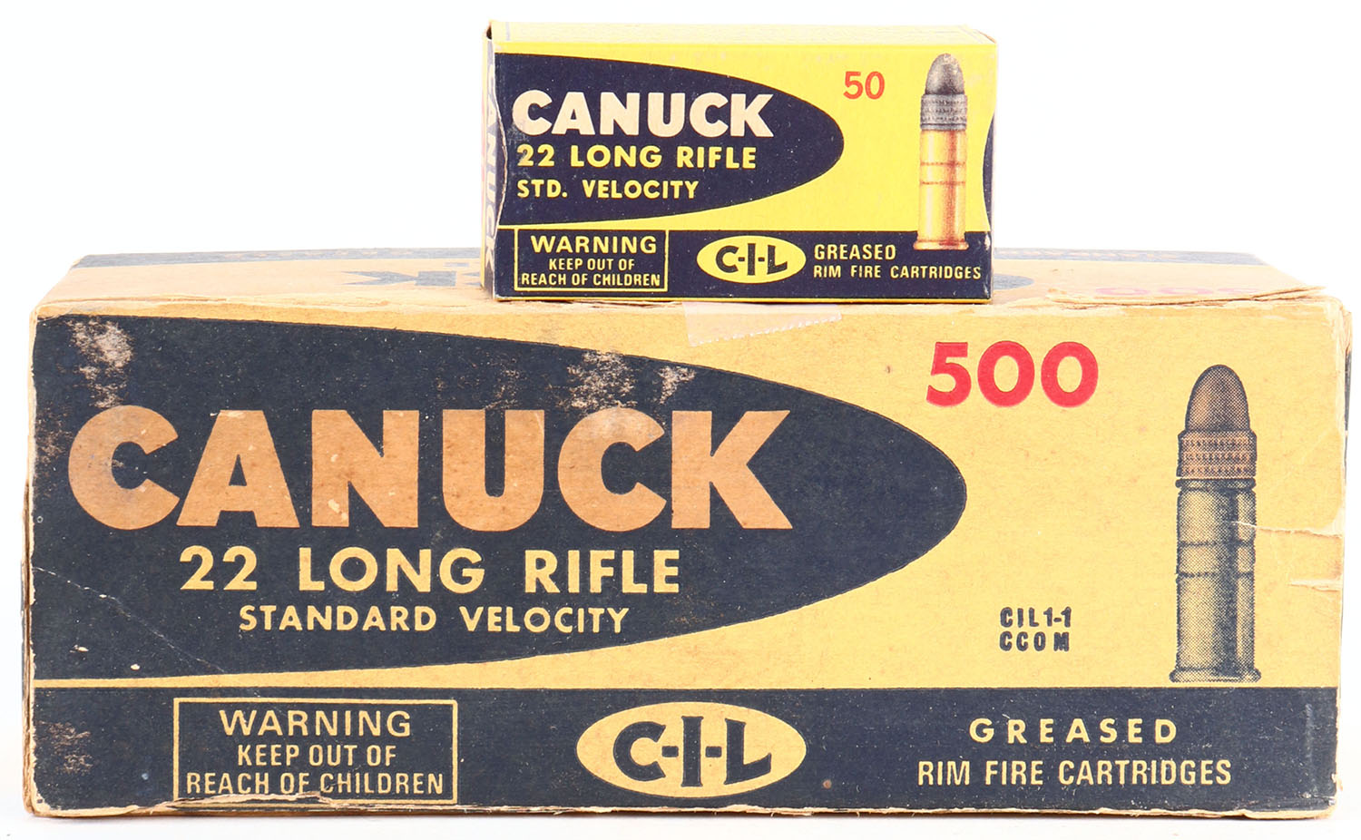 C.I.L., Canuck, .22 Long Rifle, Standard Velocity, Greased, Full 500rds., 1pc. Yellow & blue brick, top flap is torn, brick has good color, age soiling, some shelf wear, edge & corner wear, inside boxes are excellent. Grade: Good + - Value: 40 to 120
