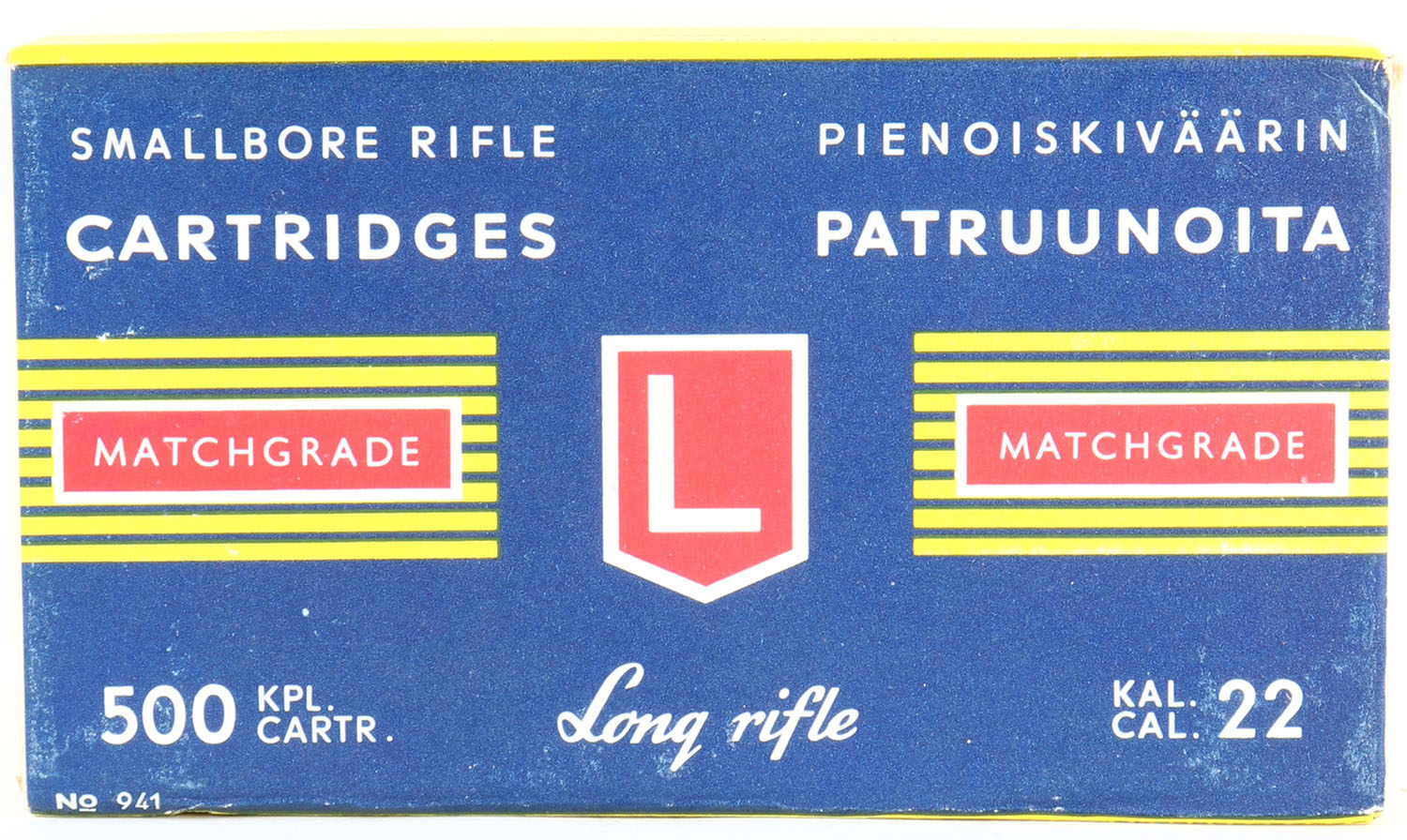 Lapua, Matchgrade, .22 Long Rifle, Smallbore Rifle Cartridges, FULL & SEALED, 1pc. Buff brick with blue yellow & red label, brick is near mint with minty color, only one very small blemish on front, corners are sharp, edges are crisp, label is intact. Grade: MINT - Value: 100 to 300