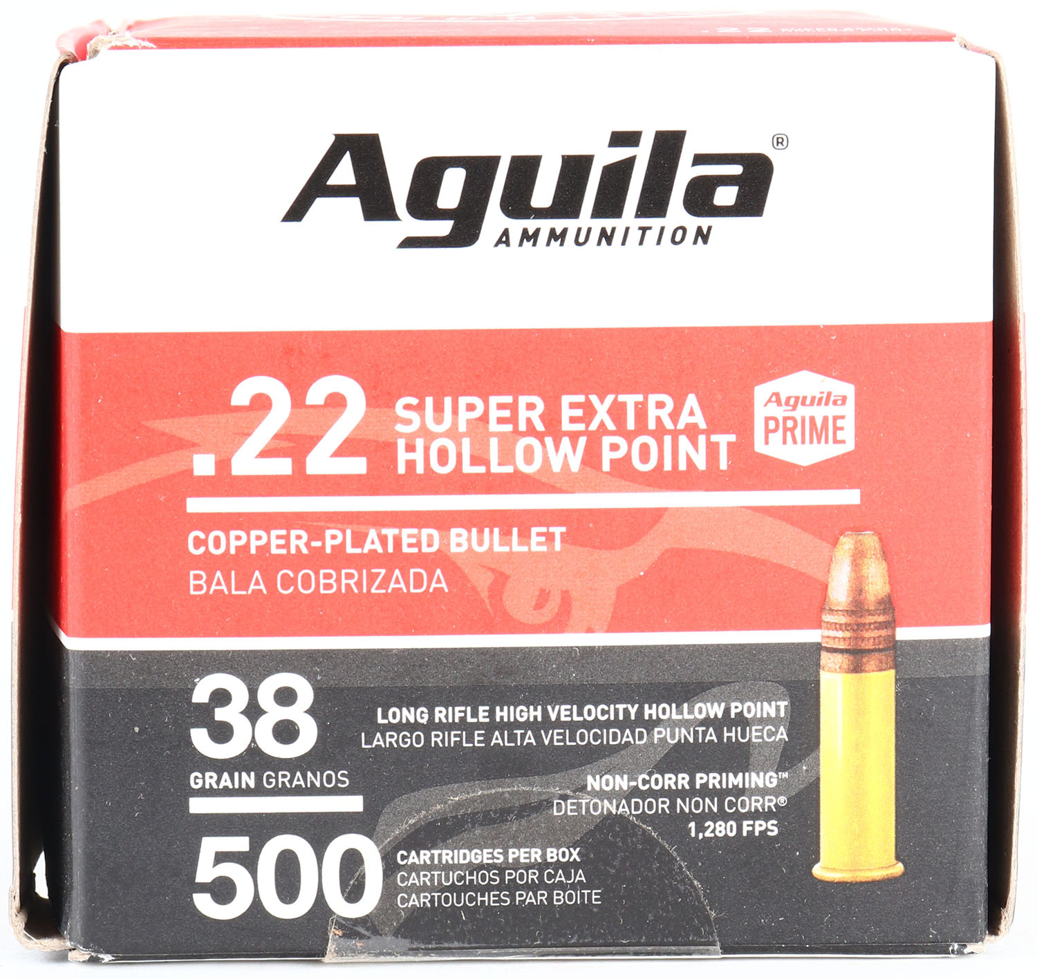 Aguila, Super Extra, .22 Long Rifle Hollow Point, 38 Grain Copper-Plated, FULL & SEALED, 500rds. 1pc. Red white & black bulk box, box is MINT with mint color, corners are sharp, edges are crisp. Grade: MINT - Value: 20 to 60