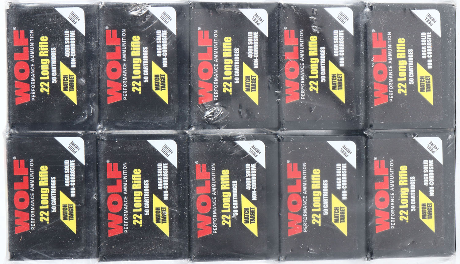 Wolf, Match Target, .22 Long Rifle, 40 Grain Solid Point, FULL & SEALED 1pc. Plastic wrapped brick, plastic has some tearing, inside boxes are mint. Grade: MINT - Value: 30 to 90