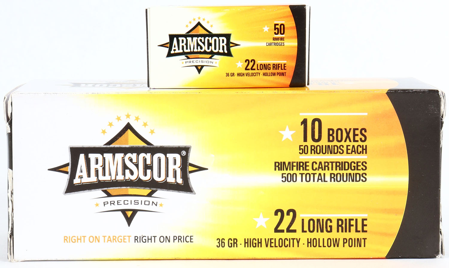 Armscor, Precision, .22 Long Rifle Hollow Point, 36 Grain, Full 500rds., 1pc. White orange & black brick, brick is MINT with mint color, corners are sharp, edges are crisp, end flaps are solid, inside boxes are mint. Grade: MINT - Value: 30 to 90