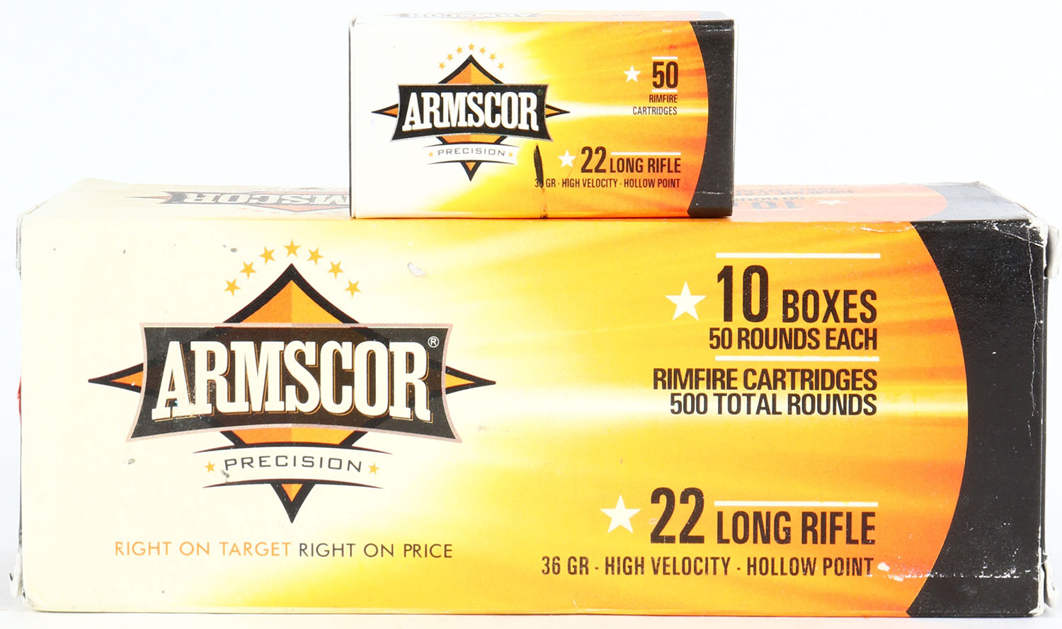 Armscor, Precision, .22 Long Rifle Hollow Point, 36 Grain, Full 500rds., 1pc. White orange & black brick, brick is solid with excellent color, corner ding on back bottom corner that has translated to one inside box, some edge & corner wear, end flaps are solid, all but one inside box is minty. Grade: Excellent - Value: 20 to 80