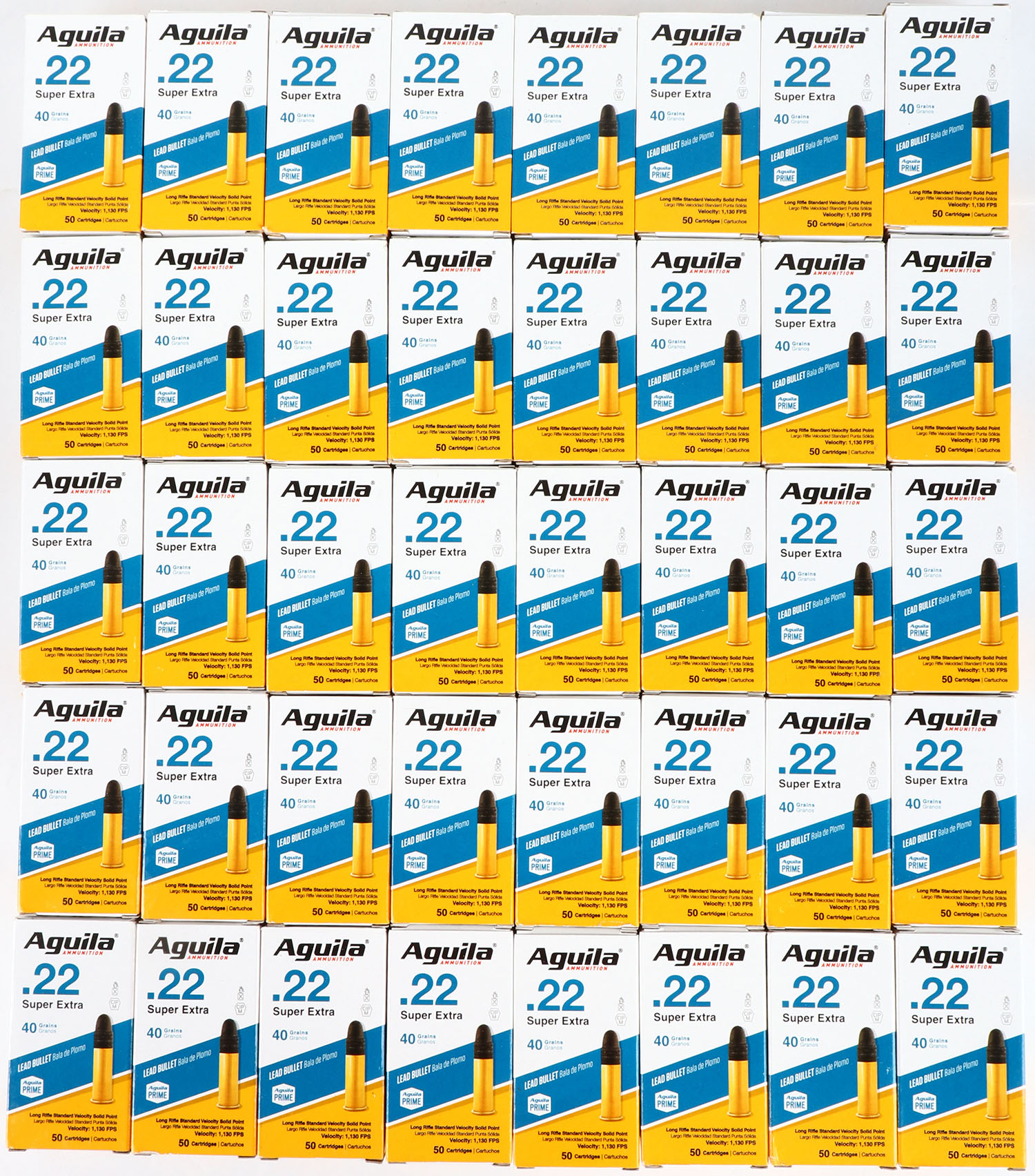 Aguila, Super Extra, .22 Long Rifle, 40 Grain Lead Bullet, 1130 FPS, Full 2,000rds. Case, case is solid, inside boxes are mint. Grade: MINT - Value: 100 to 200