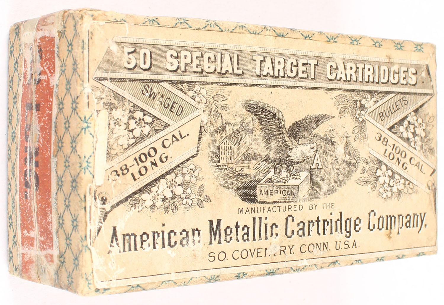 American Metallic, Special Target Cartridges, .38-100 Long, Double Waterproof, Full, 2pc. Blue & white patterned box with gray top & orange side sealing labels, box is solid with very good color, some age soiling, minor shelf wear, tape covering side sealing band which is 95% intact, very minor edge & corner wear, top label intact, ammo is very good. Grade: Very Good + - Value: 100 to 300