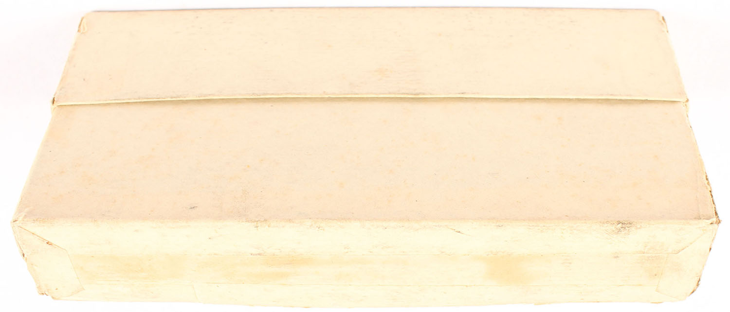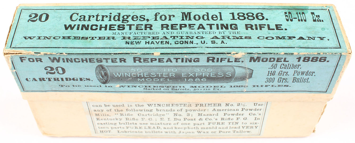 Winchester, .50-110-300 Winchester Express, Full, 2pc. Buff box with blue labels, box has excellent color with only minor age soiling, the box itself has vertical seam splits on the front right and the back left corners, as well as partial seam splits on all bottom edges except the back, the lid has partial seam splits on both ends, labels are intact, ammo is excellent. Grade: Very Good - Value: 400 to 1200