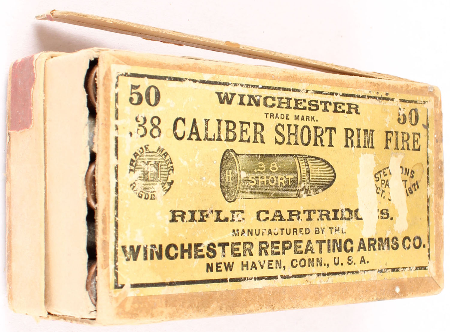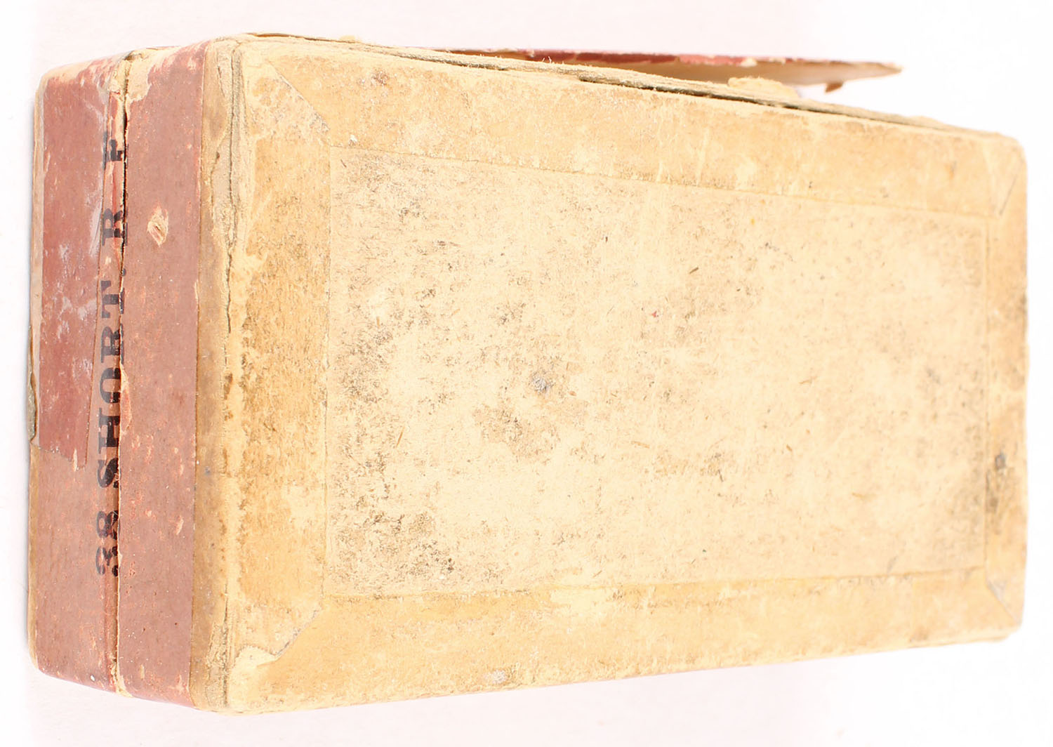 Winchester, .38 Short Rim Fire, Rifle Cartridges, Full, 2pc. Buff box with green top & red side sealing labels, box is weak with many split seams & is falling apart, rub marks, & edge wear, ammo is very good. Grade: Good + - Value: 50 to 150