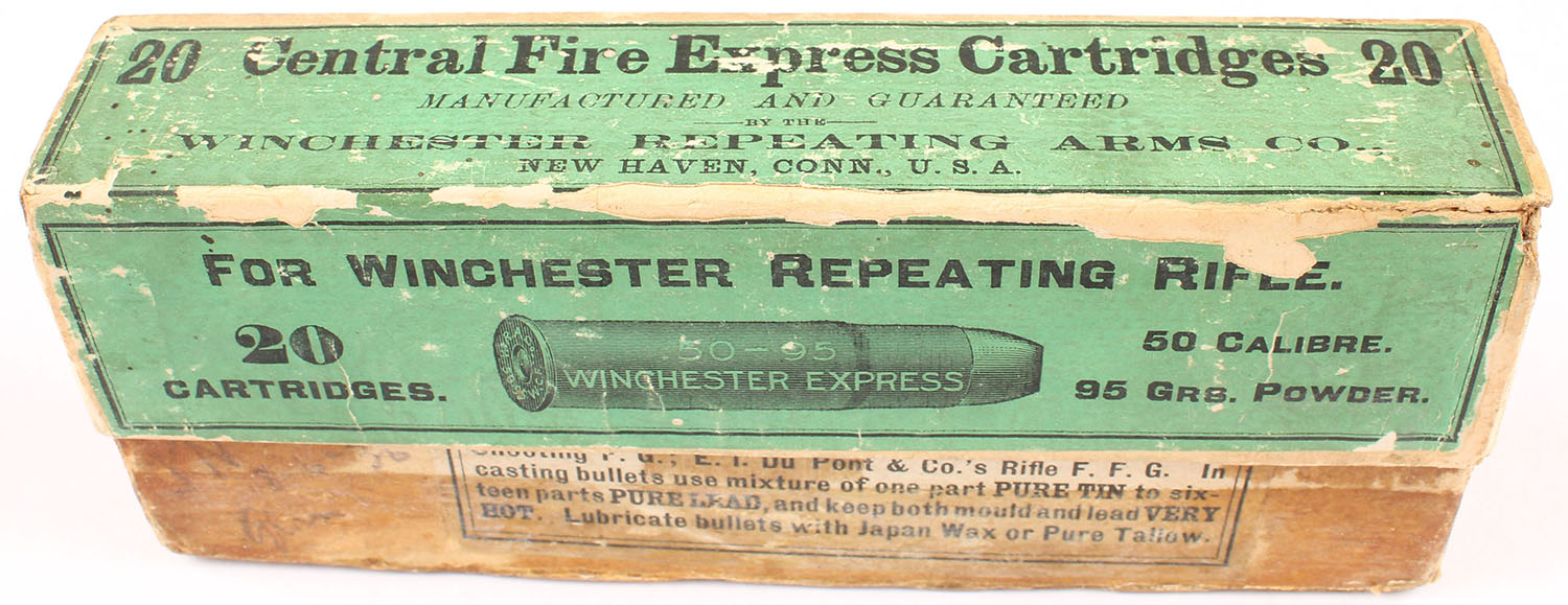 Winchester, Central Fire Express Cartridges, .50-95 Winchester Express, Full, 2pc. Buff box with green label, box is solid with good to very good color, age soiling, shelf wear, front of box and both ends of lid have been written on, some edge & corner wear, label is 99% intact, ammo is excellent. Grade: Very Good - Value: 300 to 1200