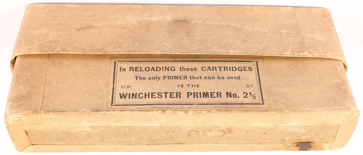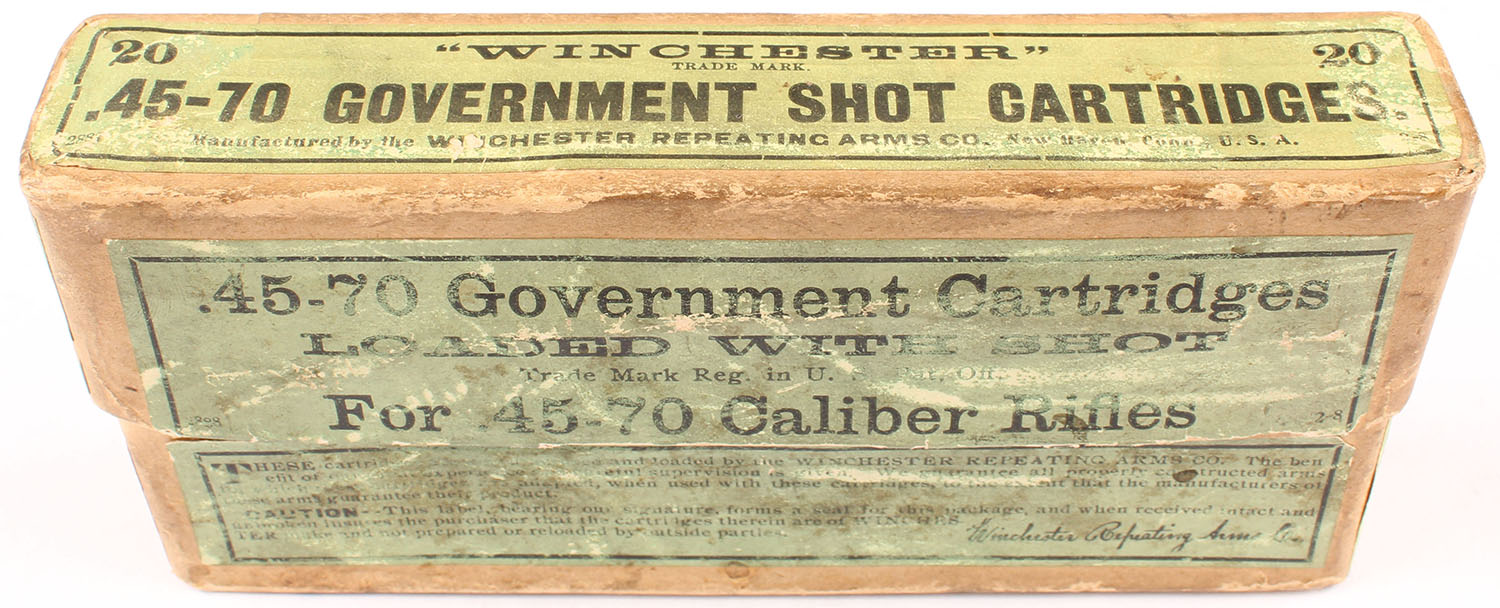 Winchester, .45-70 Government Shot Cartridges, No. 7 Shot, Full, 2pc. Buff box with green labels, box is solid with good to very good color, some age soiling & shelf wear, some edge & corner wear, labels are intact, ammo is excellent. Grade: Very Good ++ - Value: 80 to 240