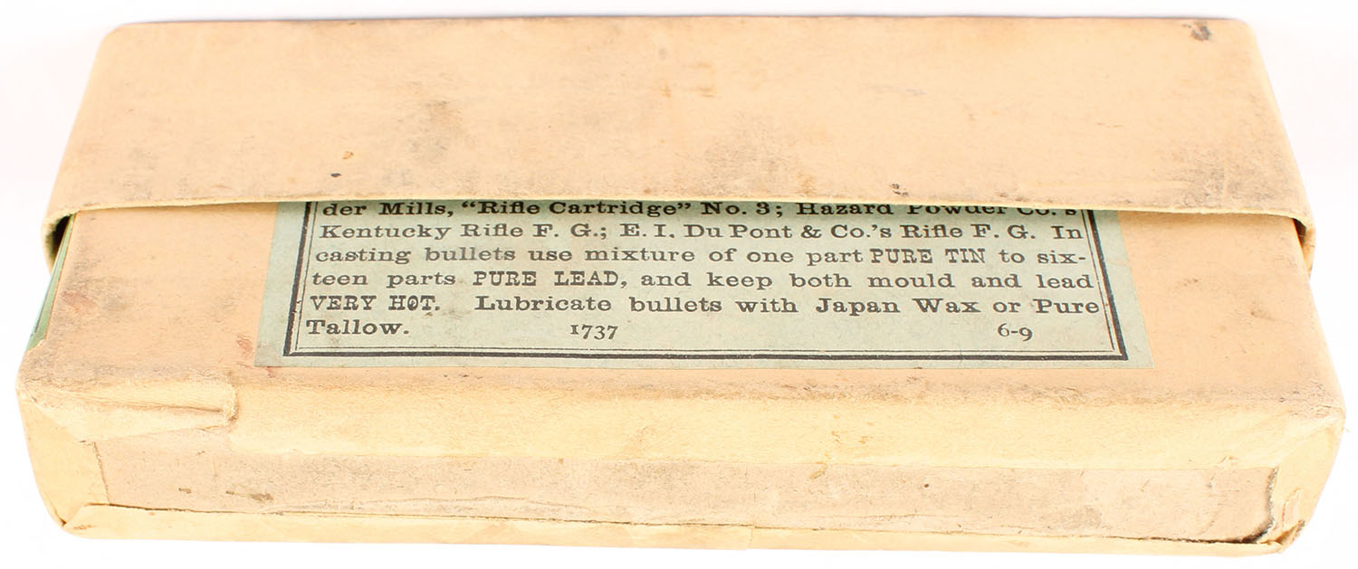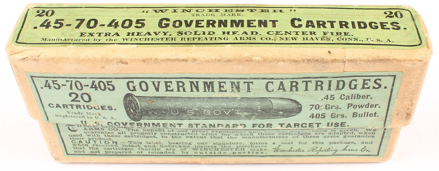 Winchester, .45-70-405 Government, Extra Heavy, Solid Head, Full, 2pc. Buff box with green labels, box is solid with excellent color, very minor age soiling, minor corner wear, very minor edge wear, labels are intact, ammo is very good. Grade: Excellent - Value: 60 to 180