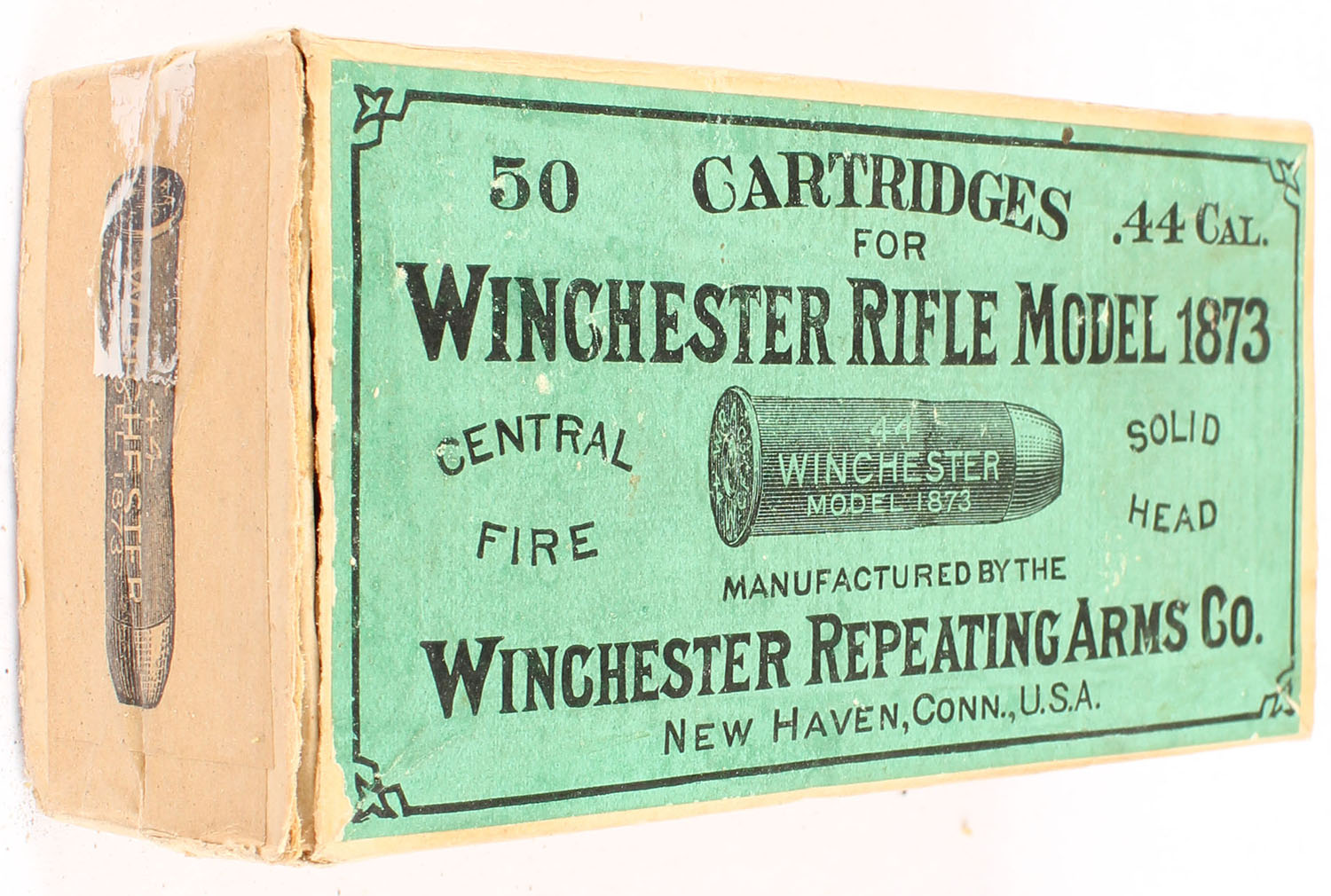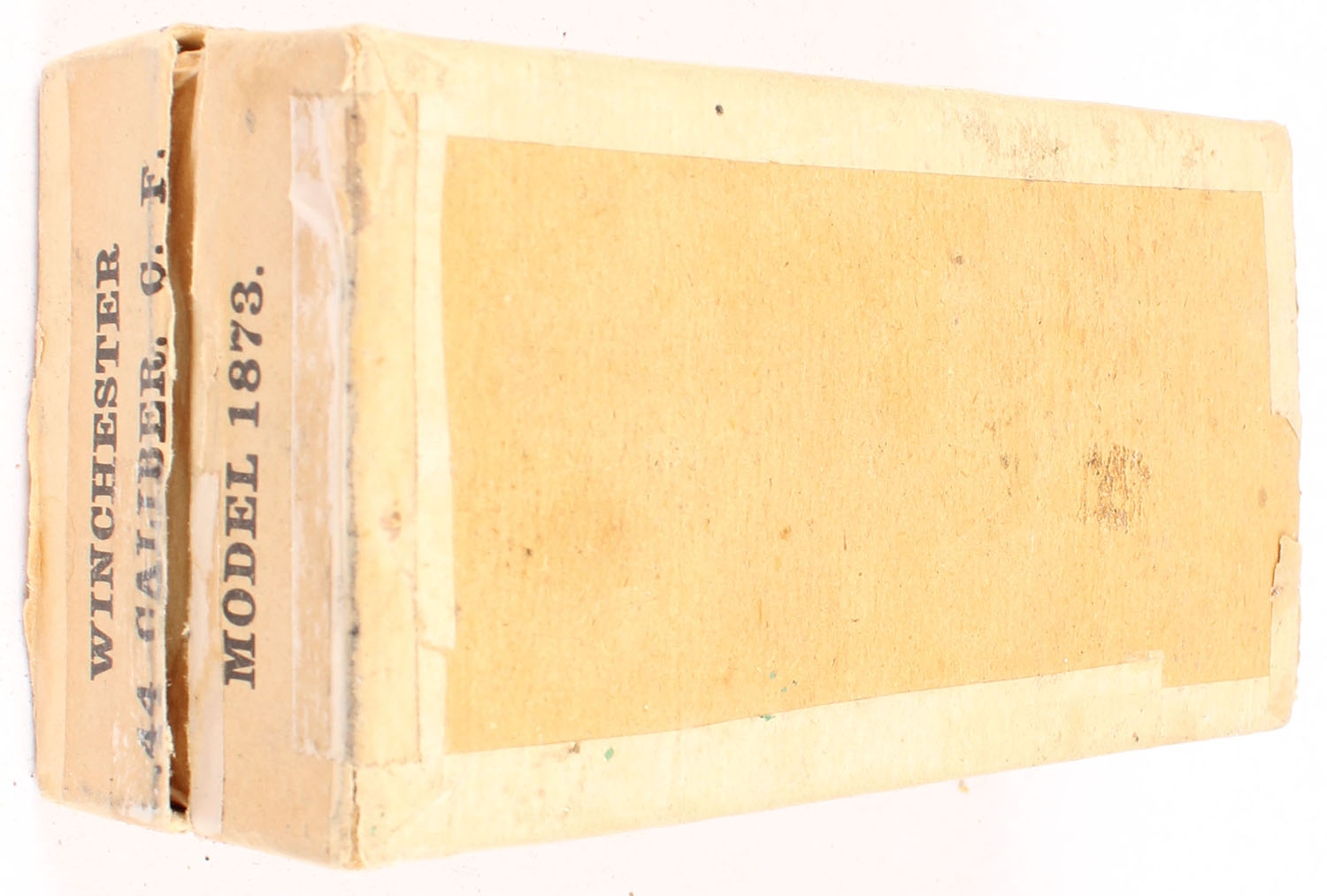Winchester, .44 Winchester Central Fire, Solid Head, Full, 2pc. Buff box with green top & buff side sealing labels, box is solid with excellent color, very minor age soiling, seam split to left edge of lid, partial seam split to right edge of lid, edges otherwise mostly crisp, very minor corner wear, labels are intact, tape on back left corner, ammo is very good. Grade: Very Good ++ - Value: 80 to 240