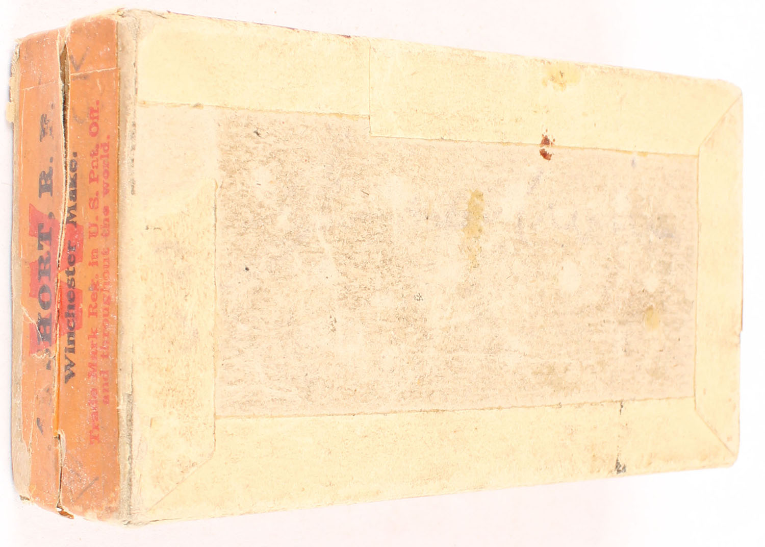 Winchester, .41 Caliber Short Rim Fire, Full & Partially Sealed, 2pc. Buff box with green top & orange side sealing labels, with insert, box is solid with excellent color, very minor age soiling, some edge & corner wear, vertical seam split on front left corner, both ends & top have been written on, labels are intact, insert is excellent, ammo is fair. Grade: Excellent - Value: 200 to 400
