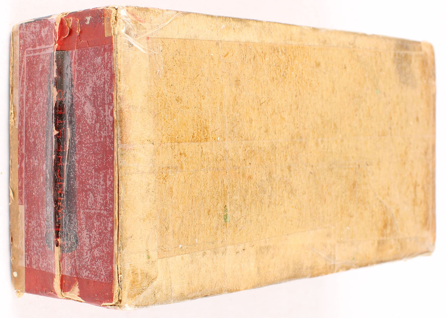 Winchester, .38 Winchester Center Fire, Solid Head, Full, 2pc. Buff box with green top & red side sealing labels, box is solid with good color, some age soiling & color fading, some shelf wear, some edge & corner wear, seam splits on left and back edge of lid, box is 70% covered in tape, labels are intact, ammo is very good to excellent. Grade: Very Good - Value: 40 to 120
