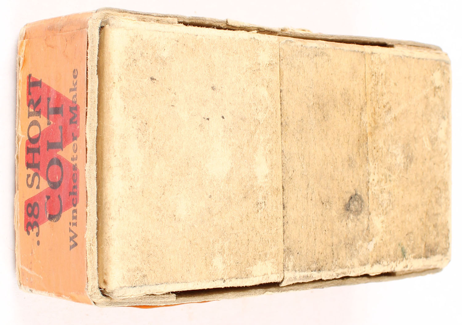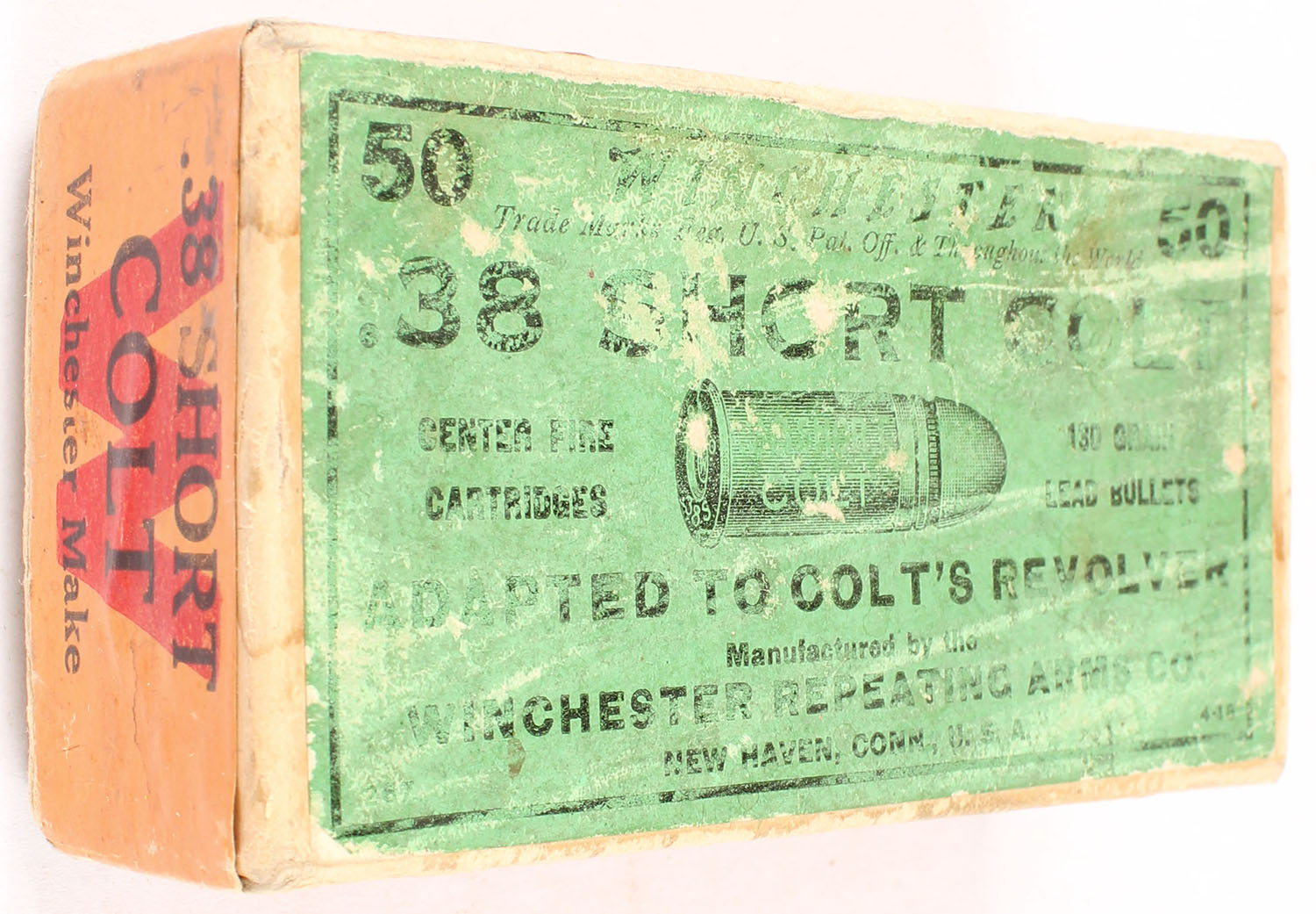 Winchester, .38 Short Colt, 130 Grain Lead Bullets, Partial 11rds. 2pc. Buff box with green top & orange side sealing labels, box is solid with good color, some age soiling, heavy shelf wear, some edge & corner wear, labels are intact, ammo is very good to excellent. Grade: Very Good - Value: 10 to 50
