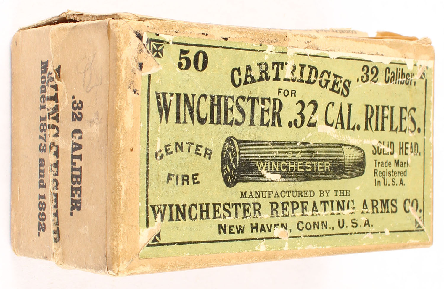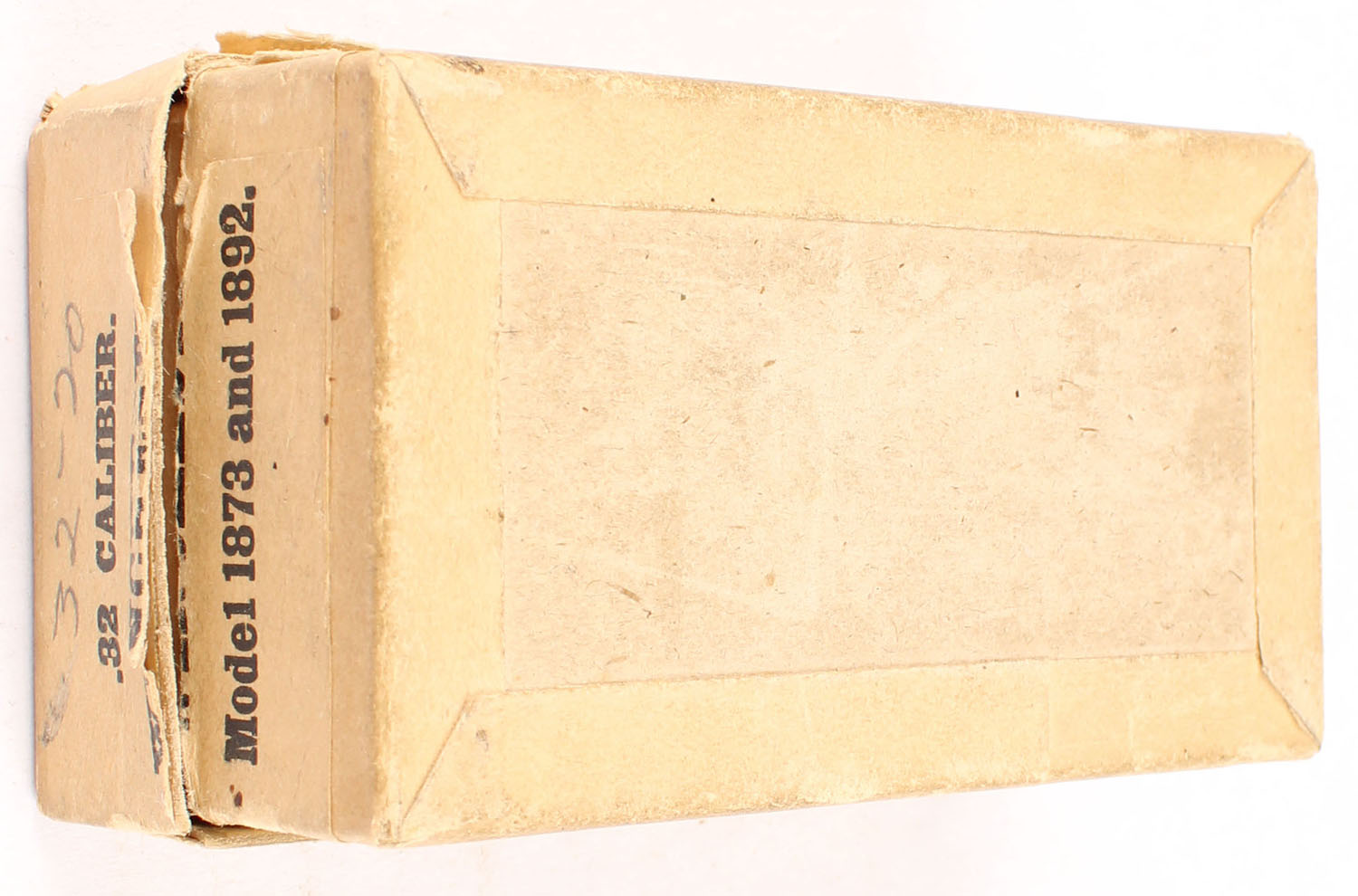 Winchester, .32 Winchester Center Fire, Solid Head, Empty, 2pc. Buff box with green top & buff side sealing labels, box is solid with very good color, some age soiling & color fading, shelf wear, some corner wear, minor edge wear, vertical seam splits to both back corners of lid, both ends have been written on. Grade: Very Good - Value: 6 to 30