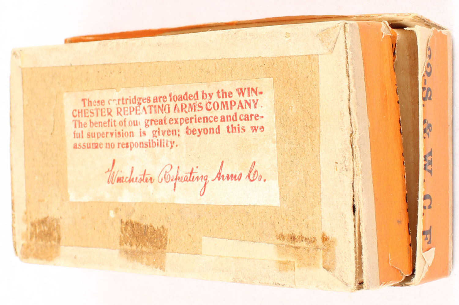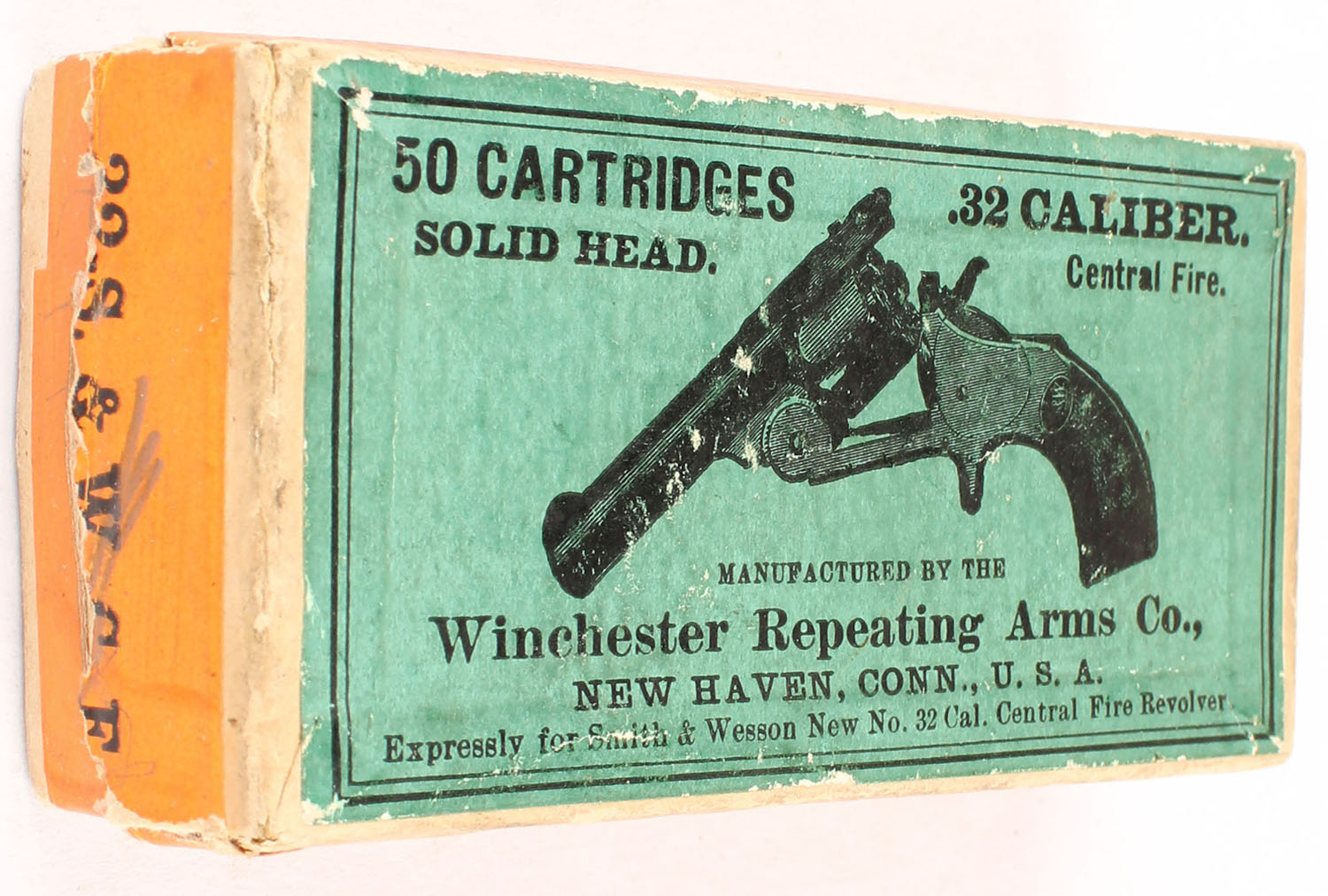 Winchester, .32 S&W, 2pc, Full, buff box with green/orange label & black print, box has very good color, two corner seam splits on lid, two seam splits on bottom box, pencil marks, minor rub marks, & light edge wear, ammo is very good. Grade: Very Good + - Value: 30 to 90