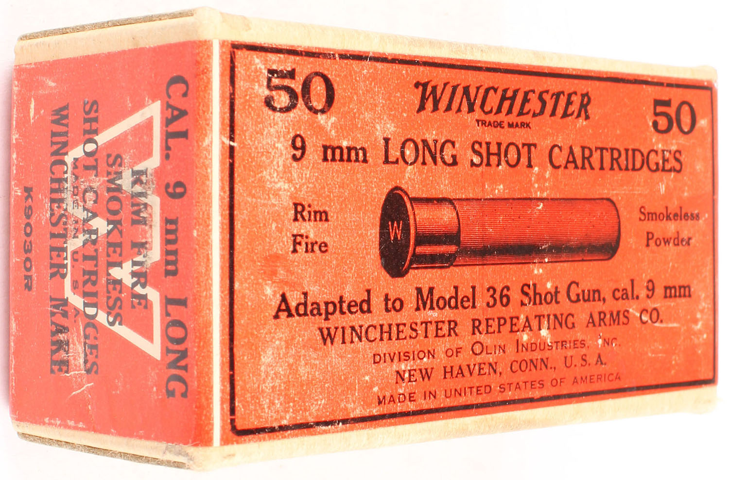 Winchester, 9mm Long Shot Cartridges, Rim Fire, FULL & SEALED, 2pc. Buff box with red wraparound label, box is solid with excellent to minty color, very minor color fading & shelf wear, very minor corner wear, edges are crisp, label is intact. Grade: Excellent ++ - Value: 200 to 600