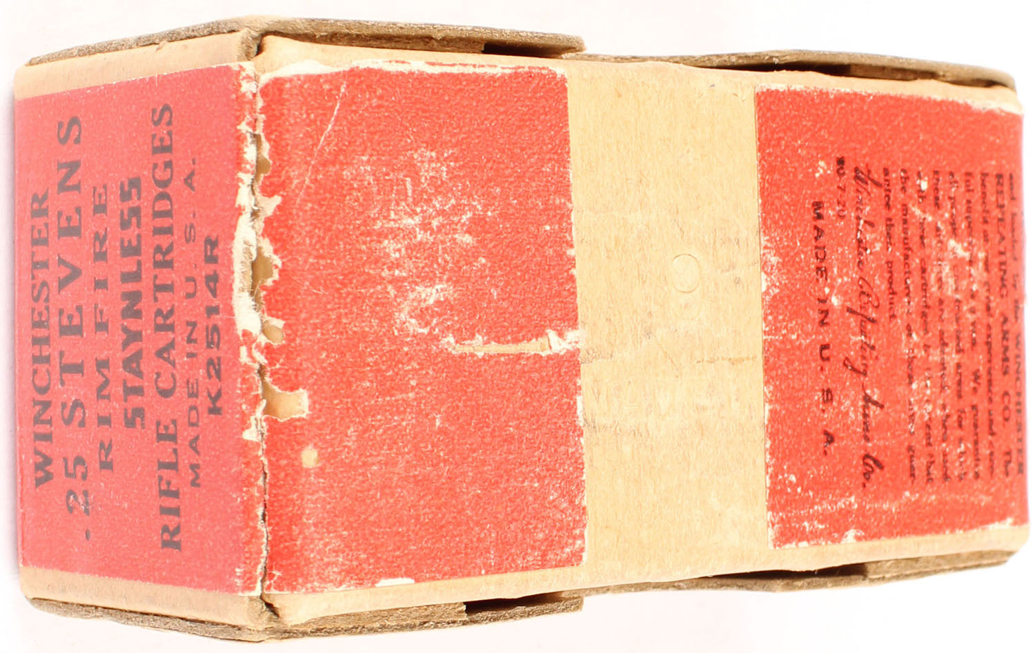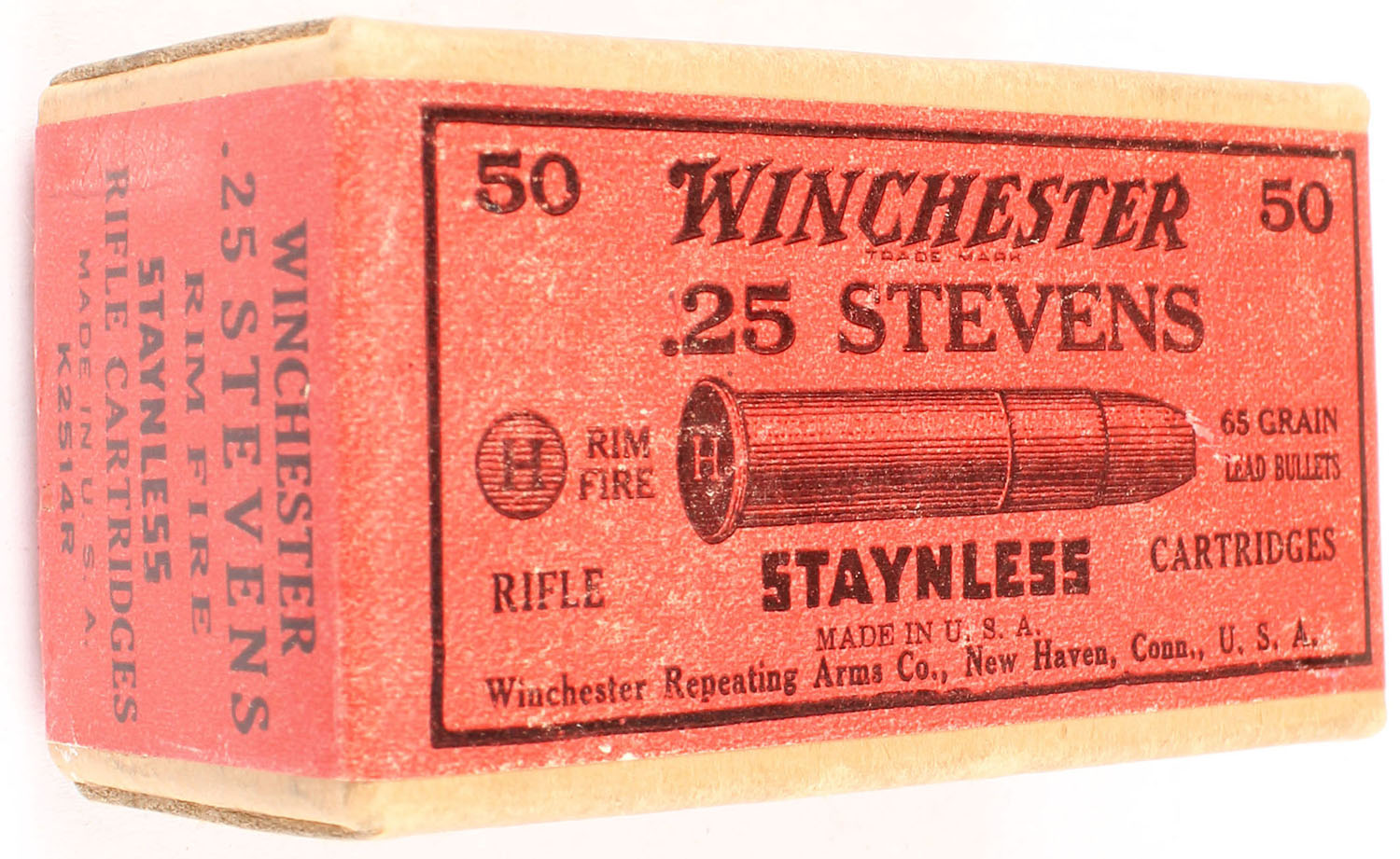 Winchester, Staynless, .25 Stevens Rim Fire, 65 Grain Lead Bullets, Full, 2pc. Buff box with red wraparound label, box is solid with excellent color, very minor age soiling & color fading corners are mostly sharp, edges are crisp, label is intact, ammo is excellent. Grade: Excellent + - Value: 50 to 150