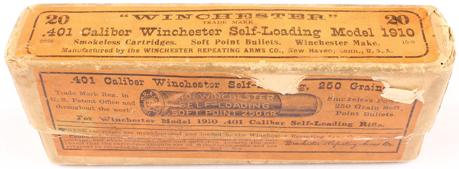 Winchester, .401 Winchester Self-Loading, Smokeless Powder, 250 Grain Soft Point Bullets, Partial 10rds., 2pc. Buff box with orange labels, box is solid with very good color, some age soiling & shelf wear, minor edge & corner wear, labels are 99% intact, bottom has been written on, ammo is very good to excellent. Grade: Excellent - Value: 20 to 60