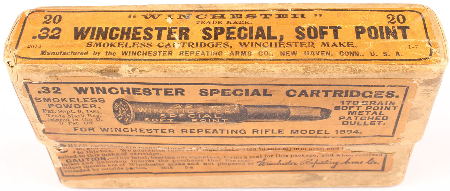 Winchester, .32 Winchester Special, Smokeless Powder, 170 Grain Soft Point Metal Patched Bullet, Partial 12rds., 2pc. Buff box with orange labels, box is solid with very good color, some age soiling & staining, minor shelf & corner wear, very minor edge wear, labels are intact, ammo is excellent. Grade: Very Good ++ - Value: 20 to 60