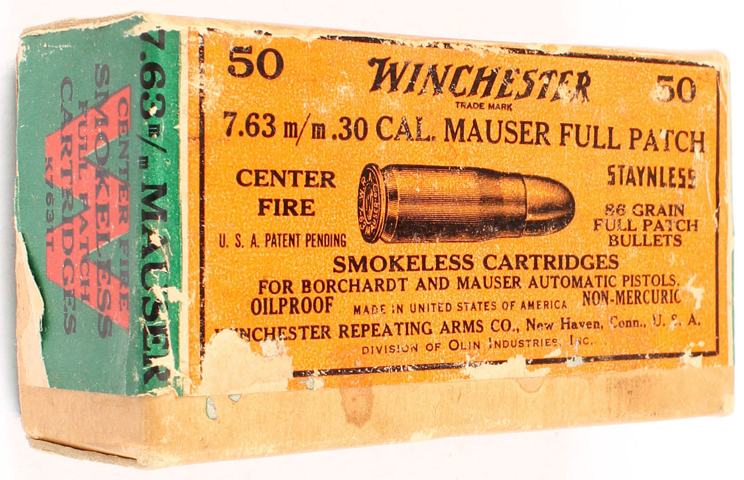 Winchester, Staynless, 7.63mm / .30 Cal. Mauser, 86 Grain Full Patch Bullets, Full of incorrect ammo, 2pc. Buff box with orange & green wraparound label, box is solid with very good to excellent color, some age soiling & shelf wear, some corner wear, edges are mostly crisp, label is intact, ammo is excellent. Grade: Excellent - Value: 20 to 60