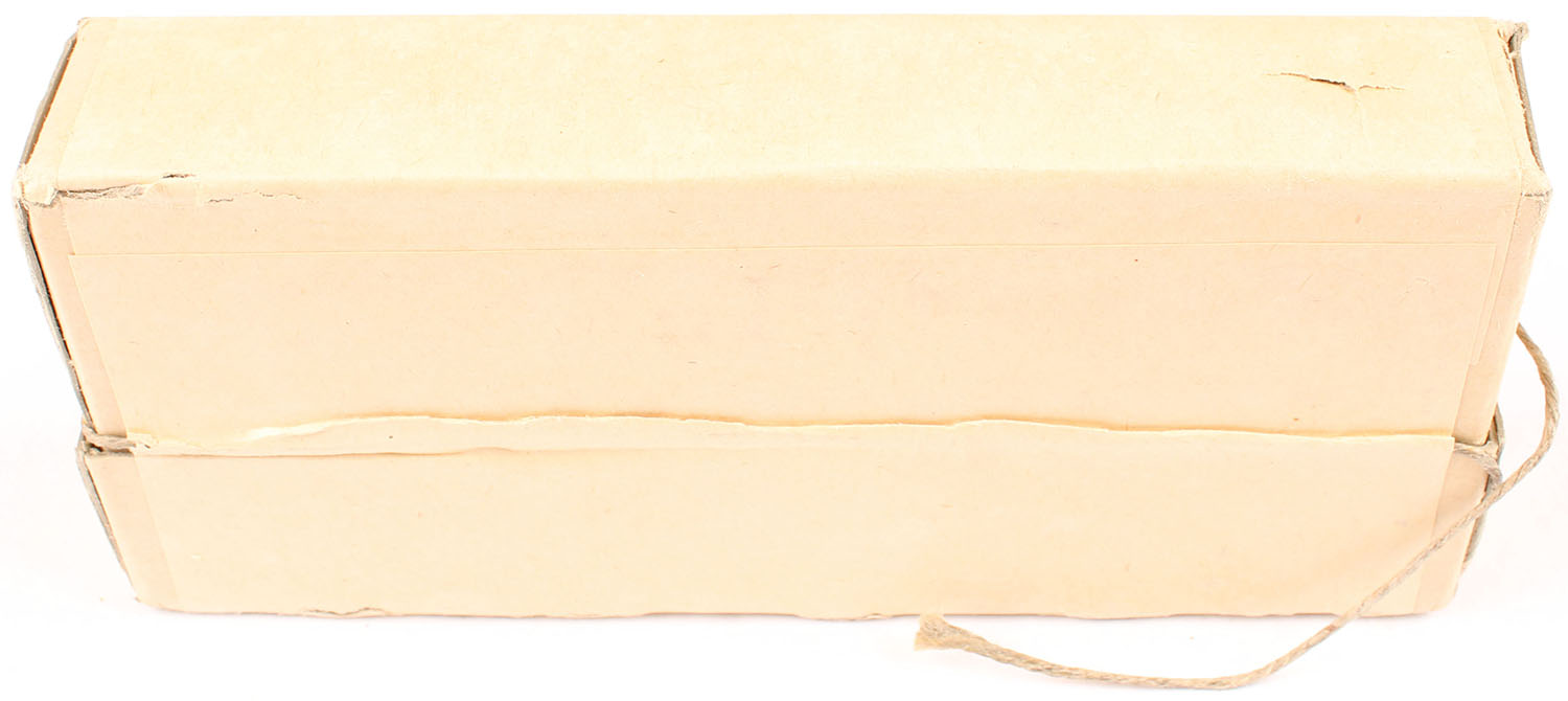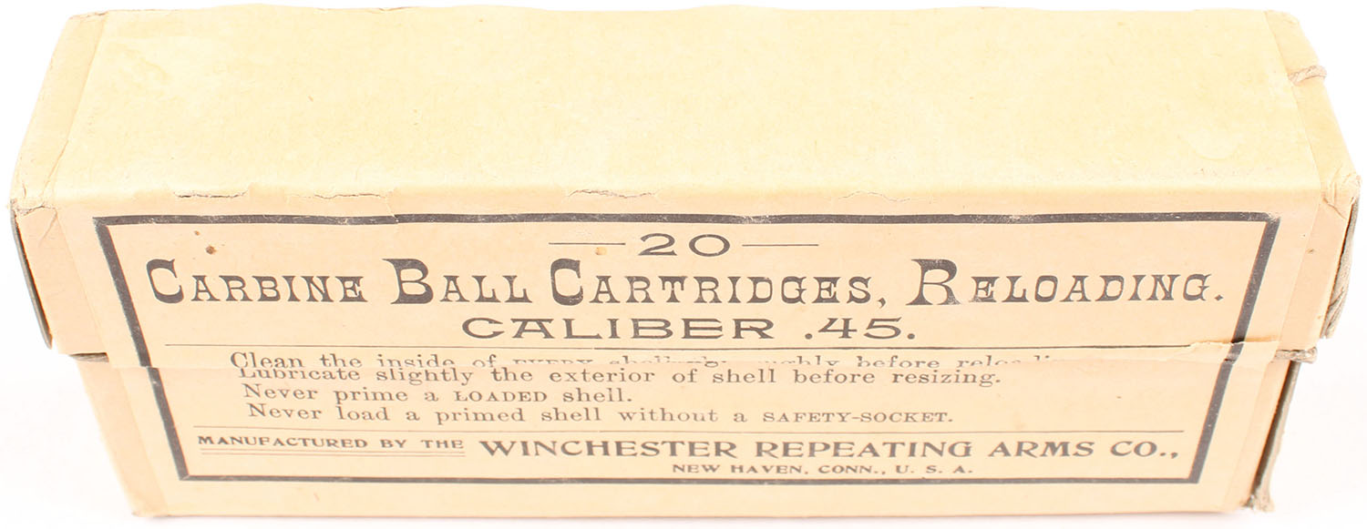 Winchester, Carbine Ball Cartridges, Reloading, .45 Caliber, Full, 2pc. Buff box with buff label, box is solid with minty color, very minor edge & corner wear, label & string are intact, ammo is excellent. Grade: Excellent ++ - Value: 50 to 150
