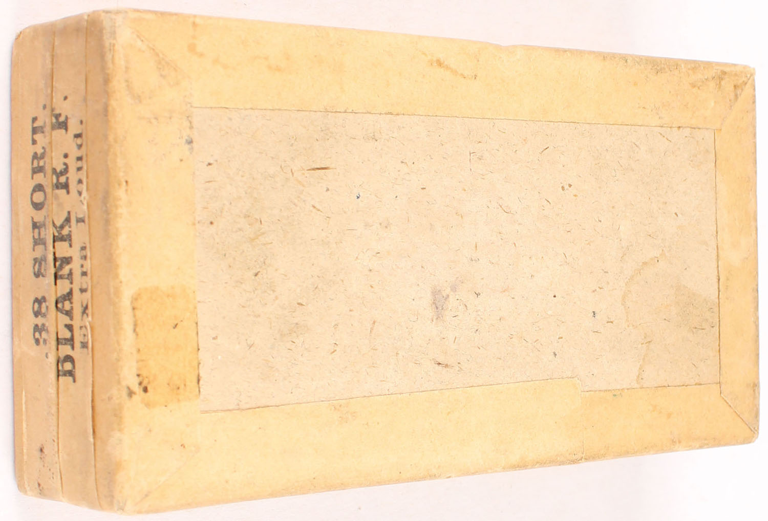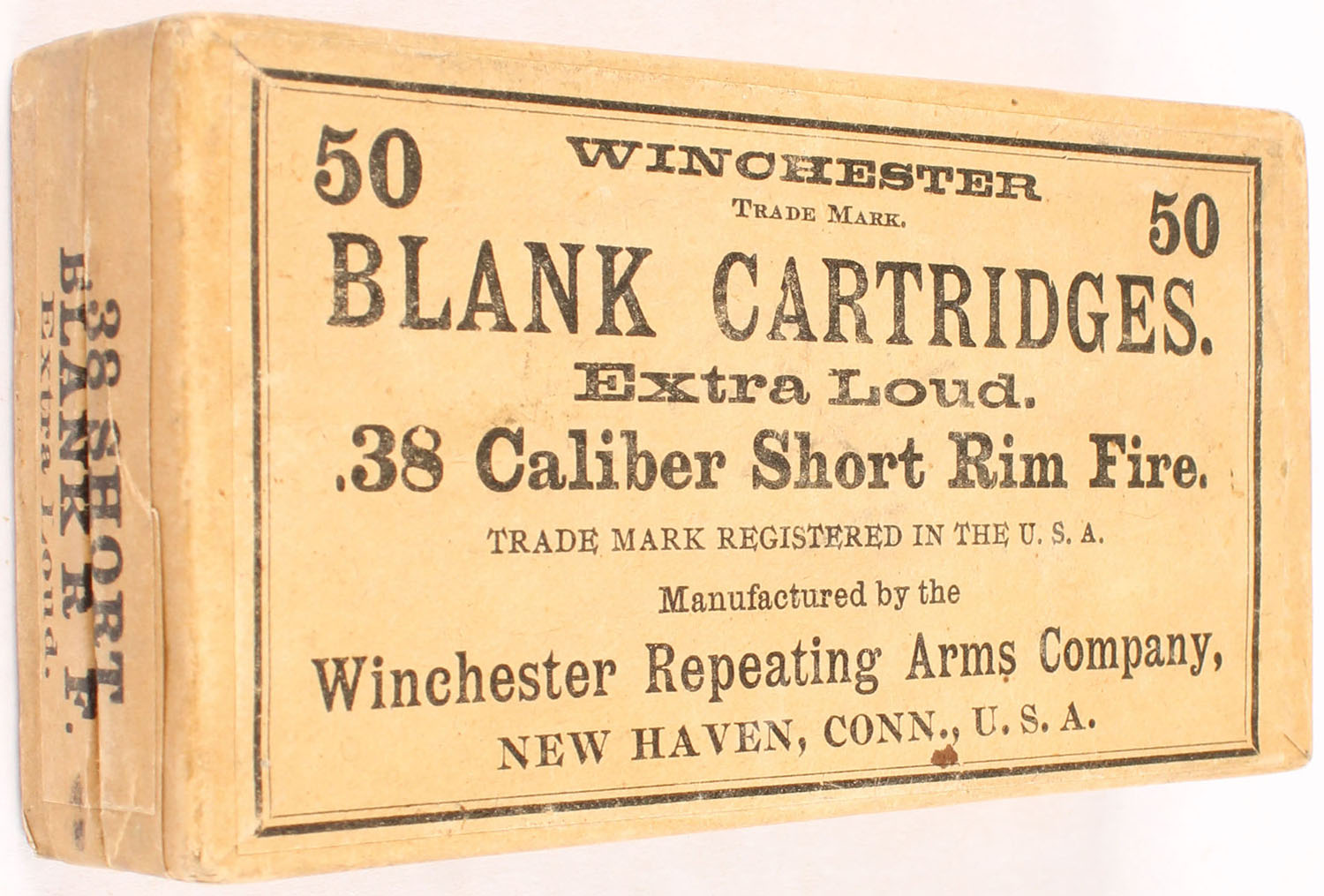 Winchester, Blank Cartridges, .38 Short Rim Fire, Extra Loud, FULL & SEALED, 2pc. Buff box with buff top & side sealing labels, box is solid with excellent color, only very minor age soiling & corner wear, edges are crisp, labels are intact. Grade: Excellent ++ - Value: 20 to 60
