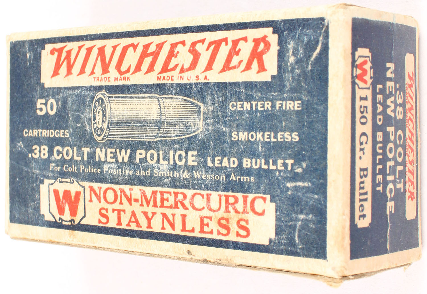 Winchester, Non-Mercuric Staynless, .38 Colt New Police, Oilproof, Full, 1pc. Blue white & red box, box is solid with very good to excellent color, minor age soiling, some shelf wear, very minor corner wear, edges are crisp, end flaps are solid, ammo is excellent. Grade: Excellent - Value: 20 to 60