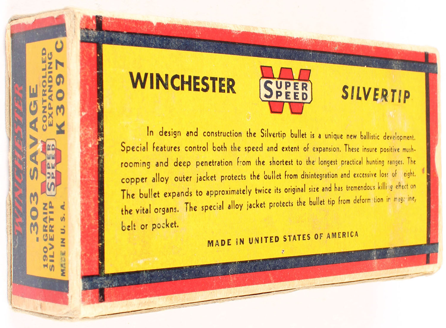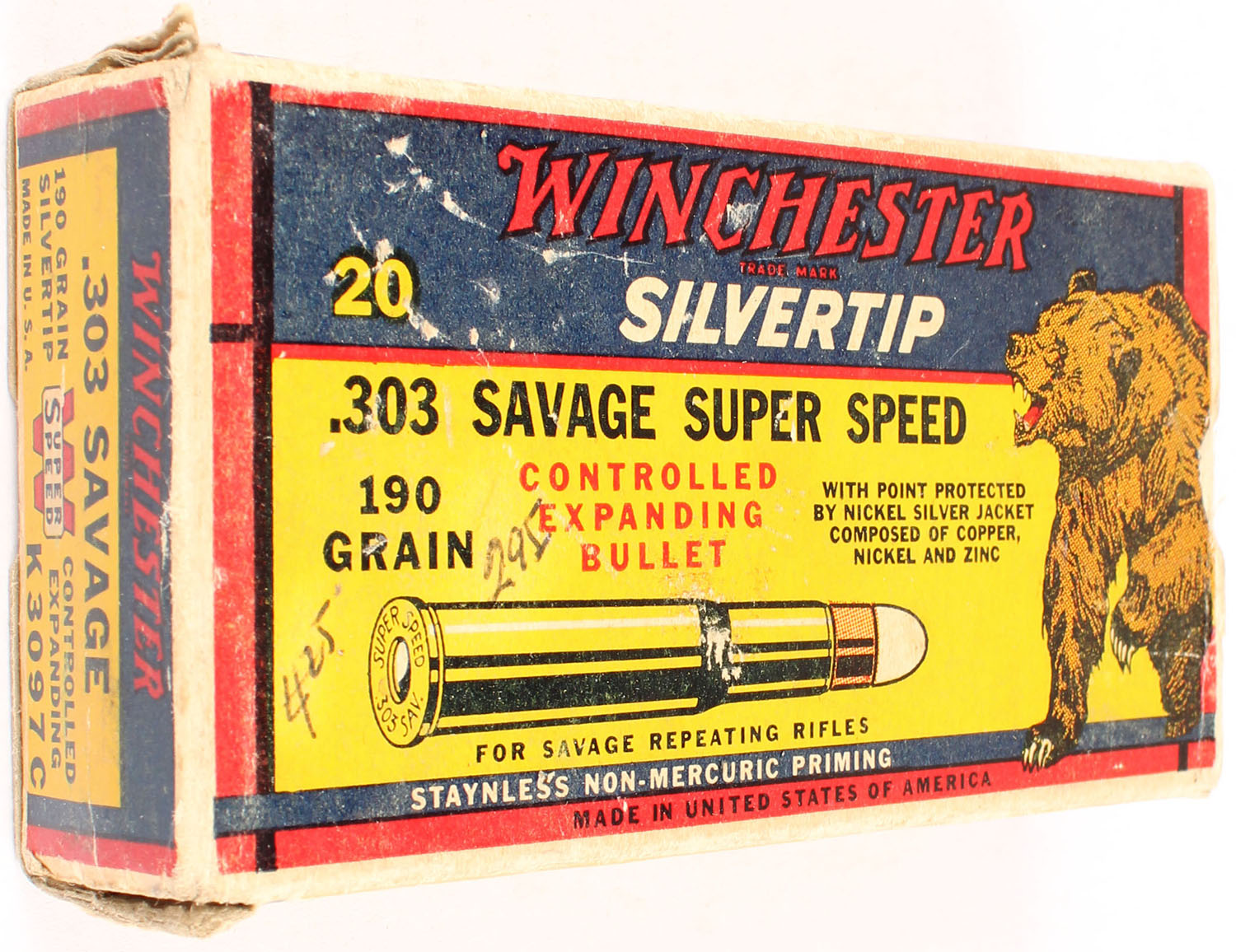 Winchester, Silvertip, .303 Savage, 190 Grain Controlled Expanding Bullet, Full, 1pc. Yellow blue & red bear box, box is solid with excellent color, very minor age soiling, some shelf & corner wear, very minor edge wear, end flaps are solid, top has been written on, ammo is very good. Grade: Excellent - Value: 50 to 150
