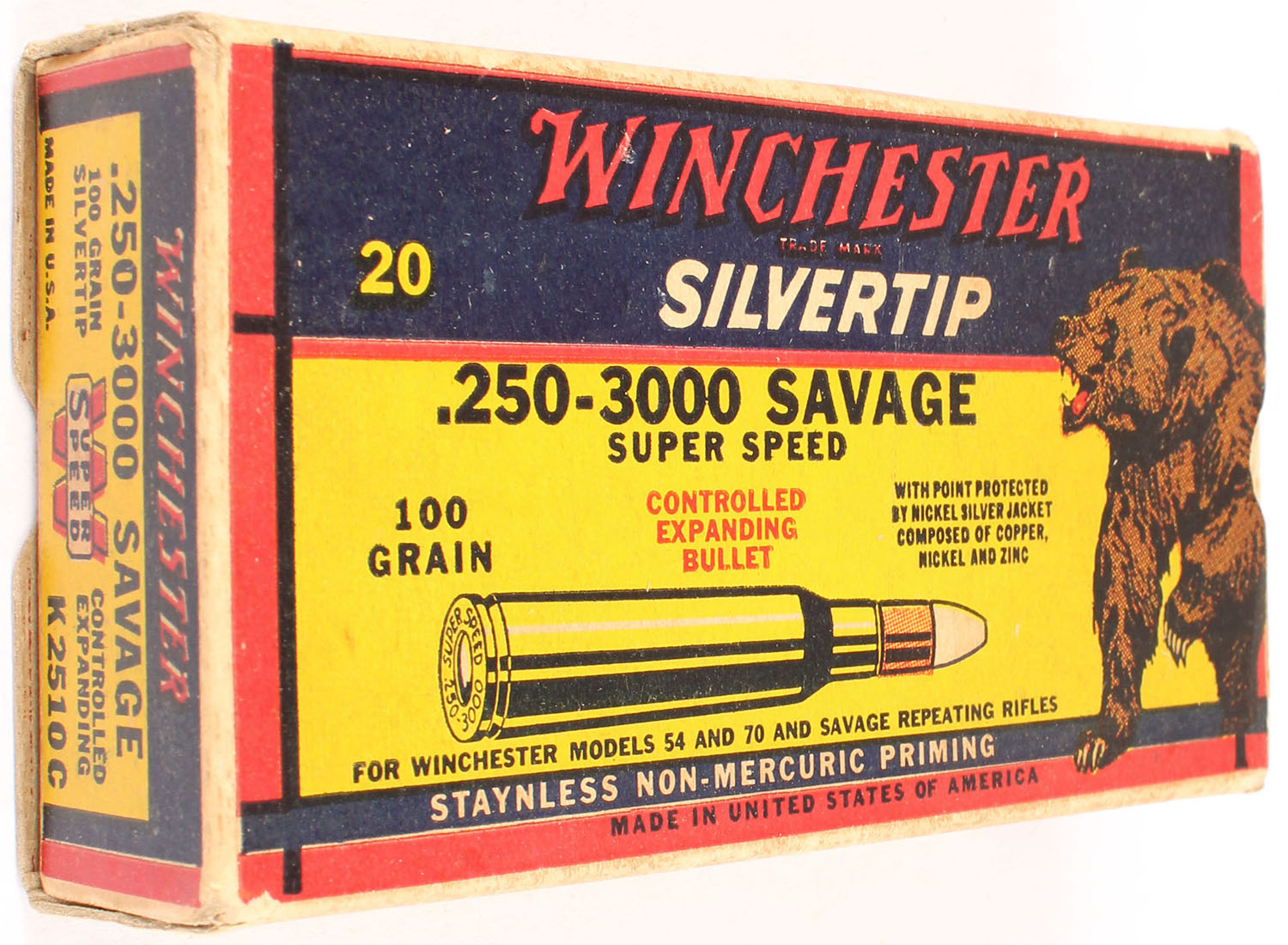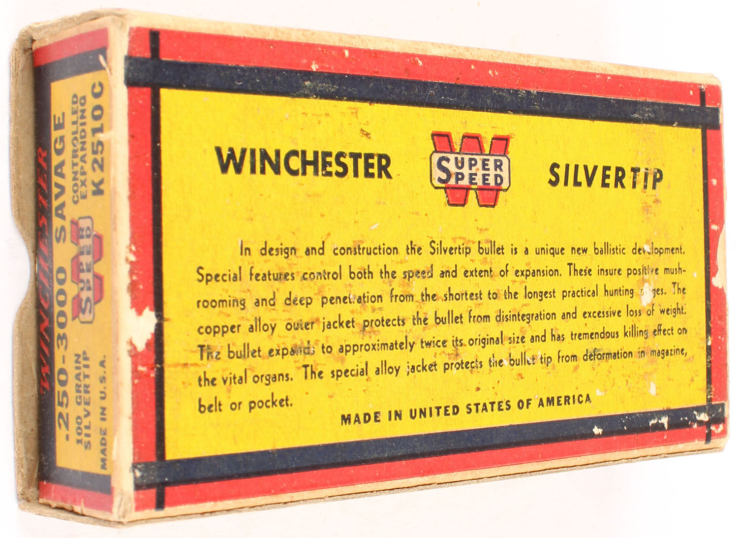 Winchester, Silvertip, .250-3000 Savage, 100 Grain Controlled Expanding Bullet, Partial 14rds., 1pc. Yellow blue & red bear box, box is solid with excellent color, very minor age soiling, some corner wear, very minor edge wear, end flaps are solid, ammo is excellent. Grade: Excellent - Value: 30 to 120