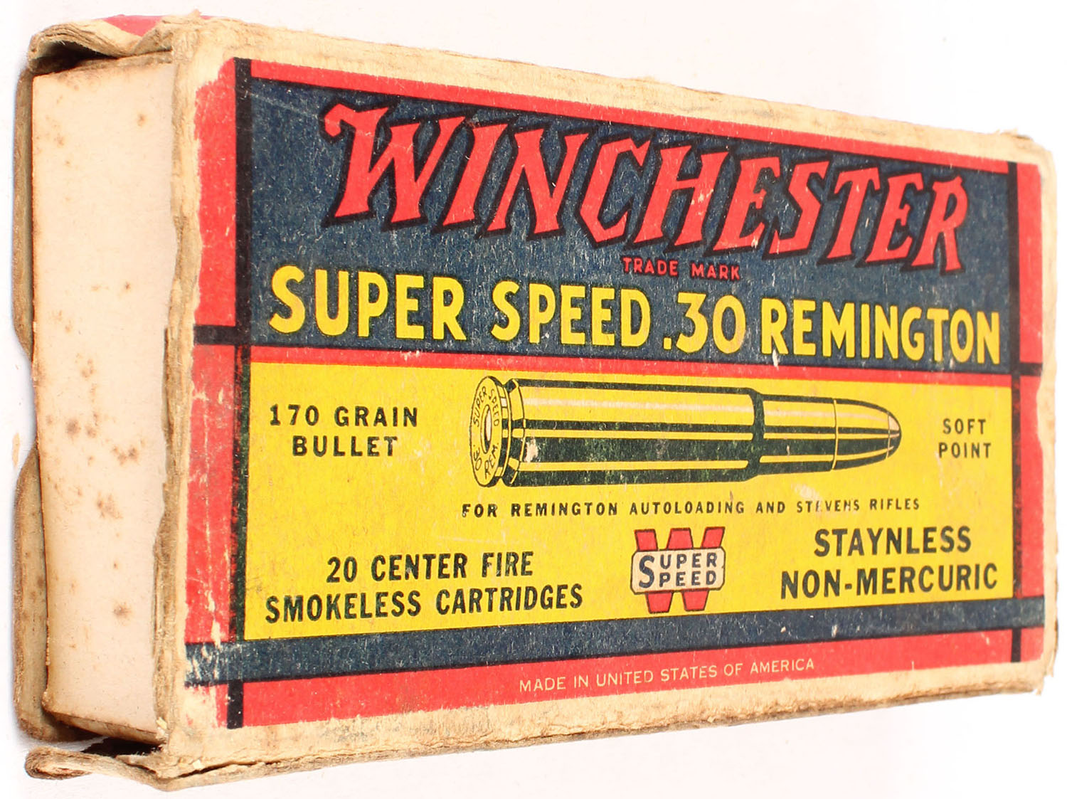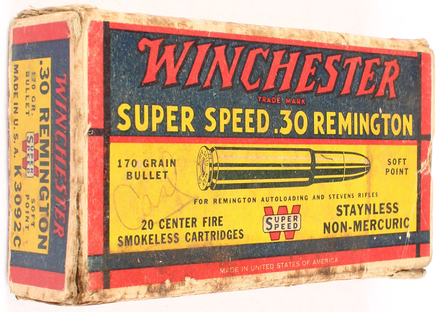 Winchester, Super Speed, .30 Remington, 170 Grain Soft Point Bullet, Partial 19rds., 1pc. Yellow blue & red box, box is missing right end flap, box has good color, age soiling & staining, edge & corner wear, top has been written on, ammo is excellent. Grade: Good - Value: 10 to 50