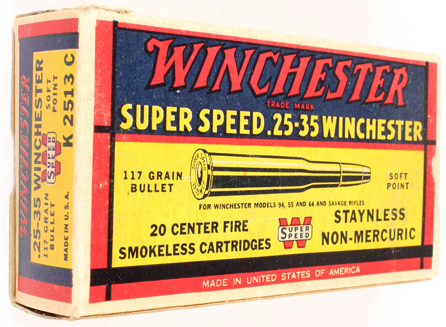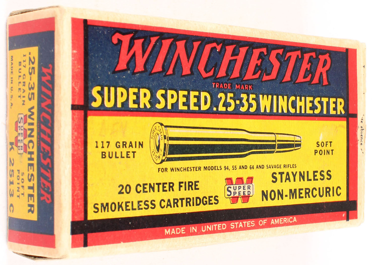 Winchester, Super Speed, .25-35 Winchester, 117 Grain Soft Point Bullet, Full, 1pc. Yellow blue & red box, box is solid with excellent color, minor age soiling & shelf wear, very minor corner wear, edges are mostly crisp, end flaps are solid, top has been written on, ammo is excellent. Grade: Excellent - Value: 50 to 150