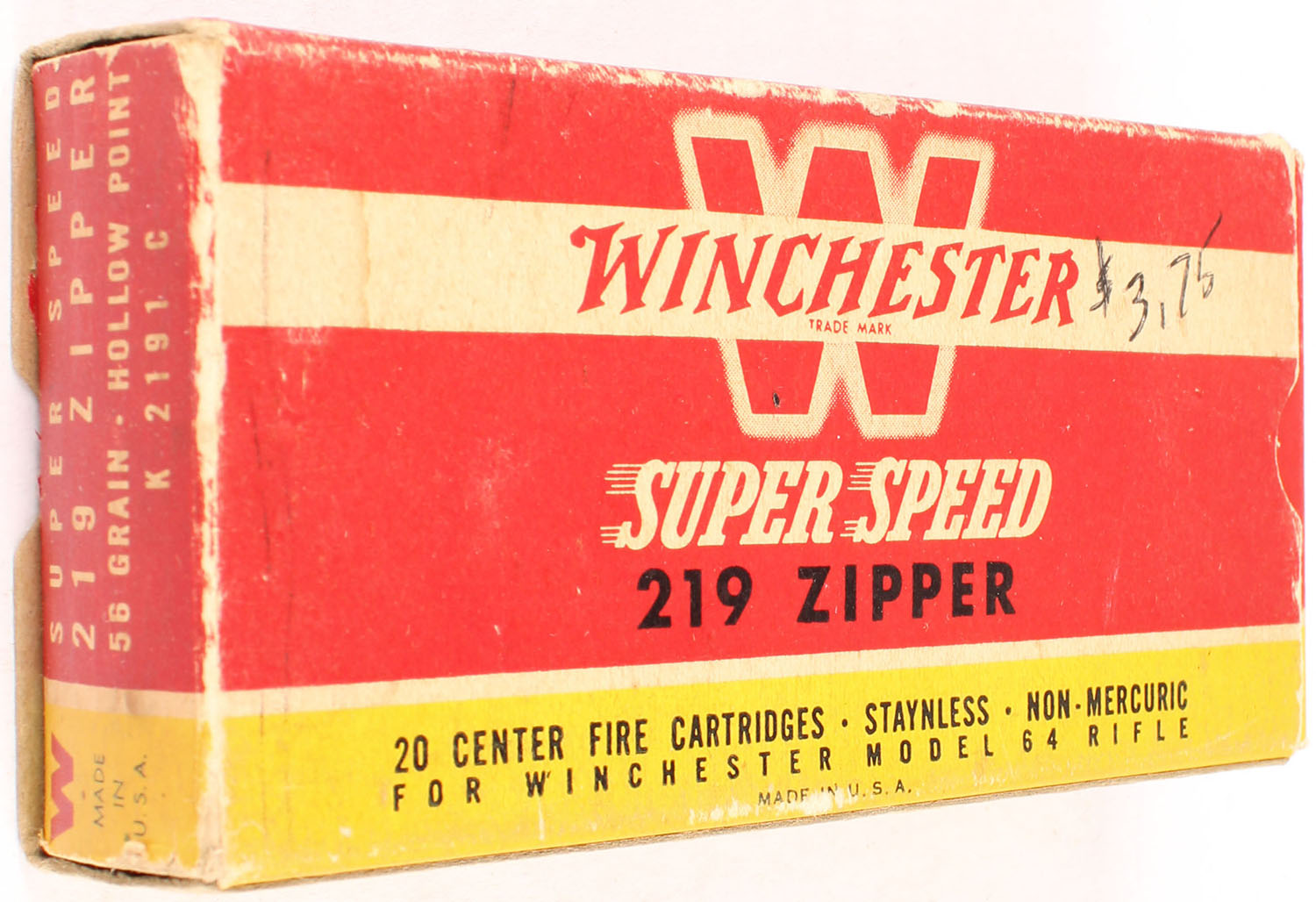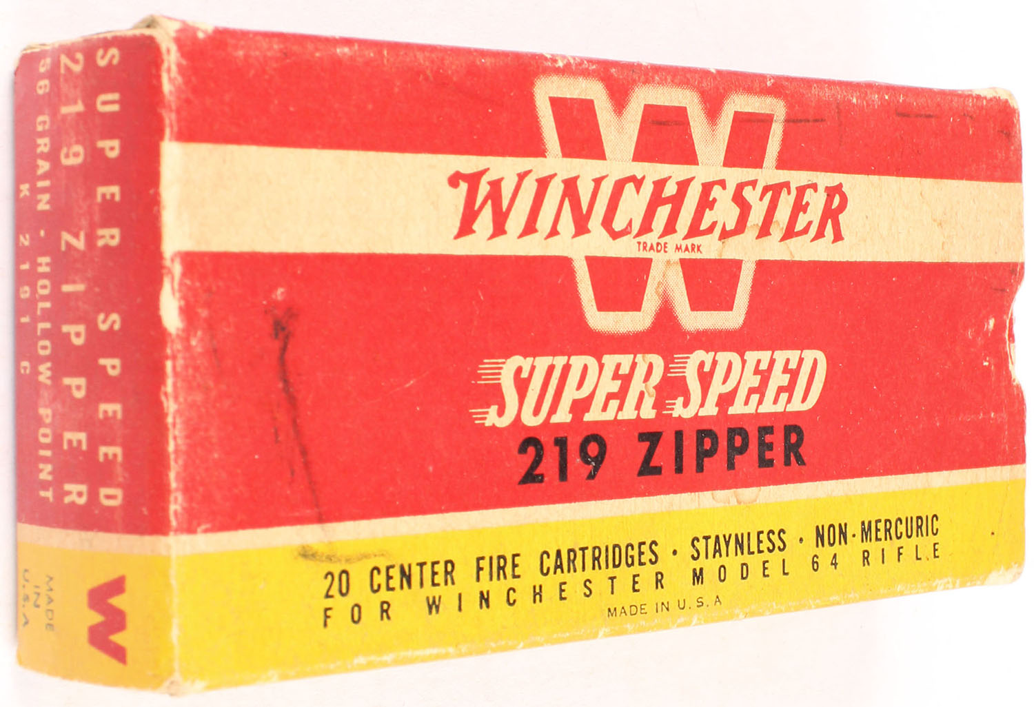 Winchester, Super Speed, .219 Zipper Hollow Point, 56 Grain H.P., Full, 1pc. Red yellow & white box, box is solid with very good color, some age soiling & staining, some corner wear, minor edge wear, end flaps are solid, bottom has been written on, ammo is excellent. Grade: Very Good + - Value: 50 to 150