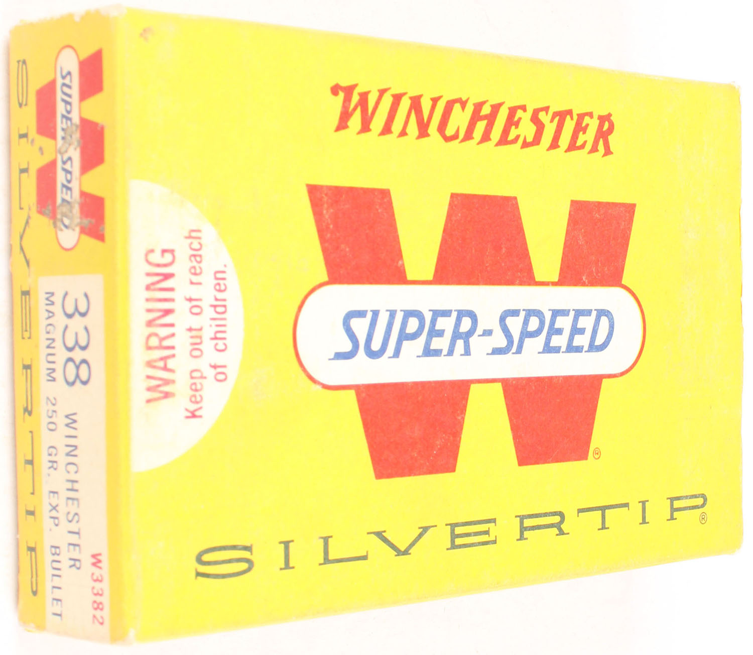 Winchester, Silvertip, .338 Winchester Magnum, 250 Grain Expanding Bullet, Full, 1pc. Yellow white & red box, box is solid with excellent color, some shelf wear, very minor corner wear, edges are crisp, end flaps are solid, ammo is excellent. Grade: Excellent - Value: 30 to 90