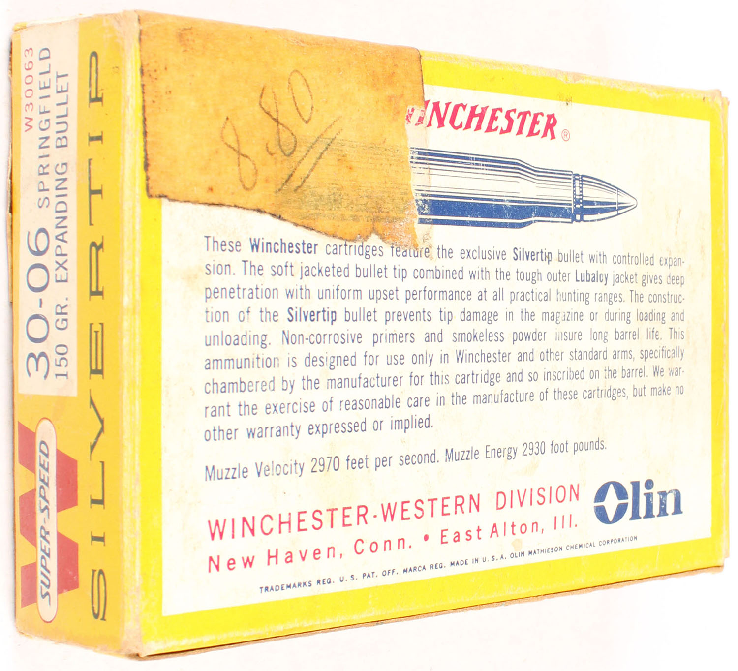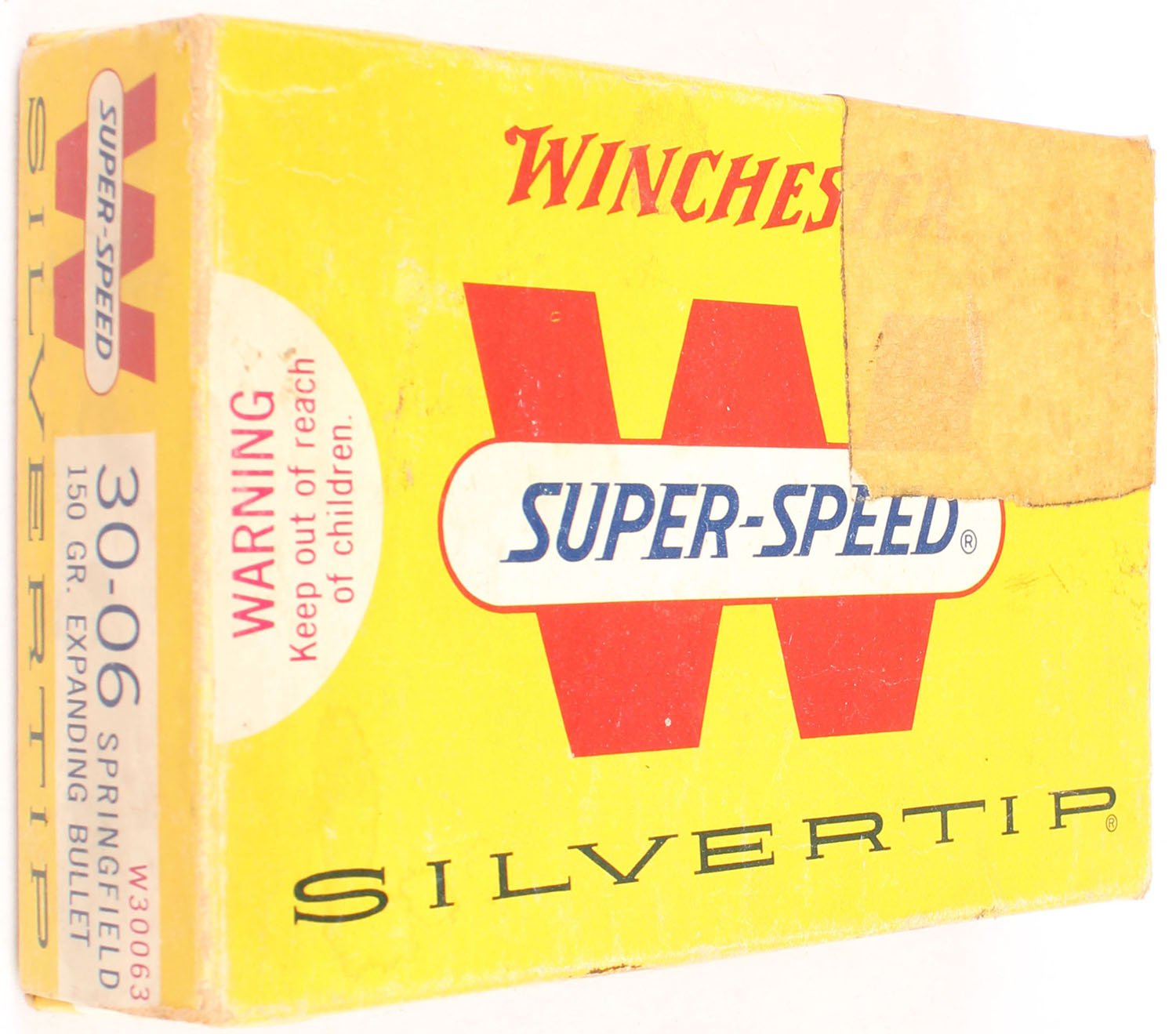 Winchester, Silvertip, .30-06 Springfield, 150 Grain Expanding Bullet, Full, 1pc. Yellow white & red box, box is solid with very good to excellent color, some age soiling & shelf wear, tape on right end, minor corner wear, very minor edge wear, end flaps are solid, ammo is excellent. Grade: Very Good + - Value: 20 to 60