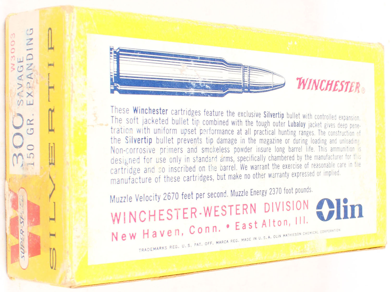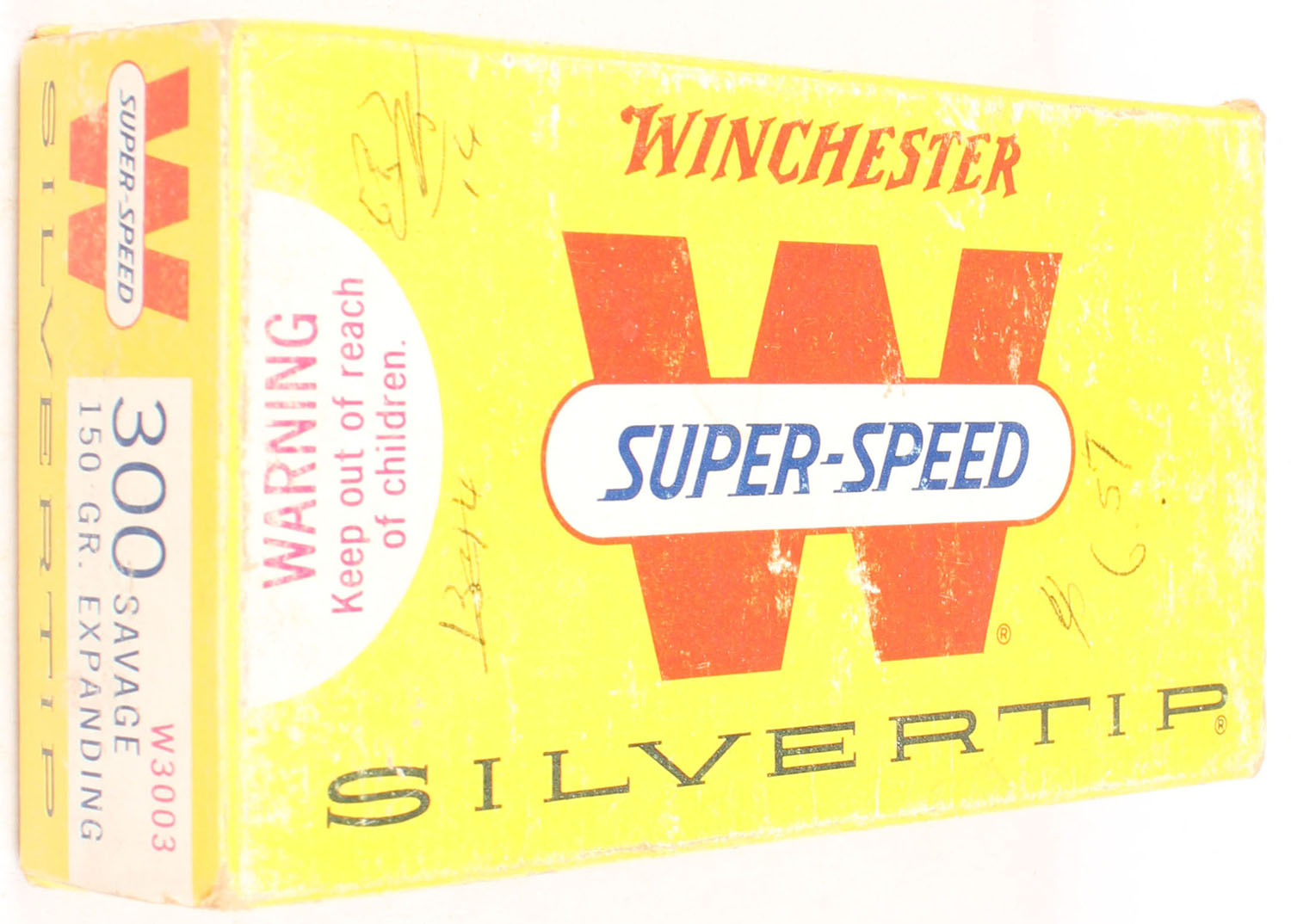 Winchester, Silvertip, .300 Savage, 150 Grain Expanding Bullet, Full, 1pc. Yellow white & red box, box is solid with excellent color, some shelf wear, minor edge & corner wear, top has been written on, end flaps are solid, ammo is excellent. Grade: Very Good ++ - Value: 20 to 60