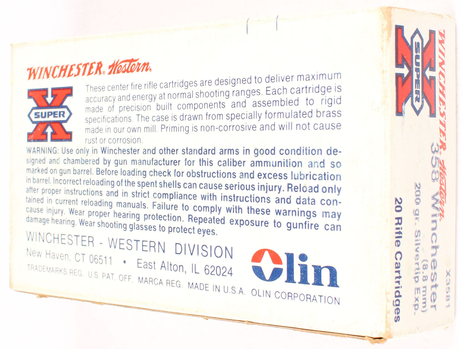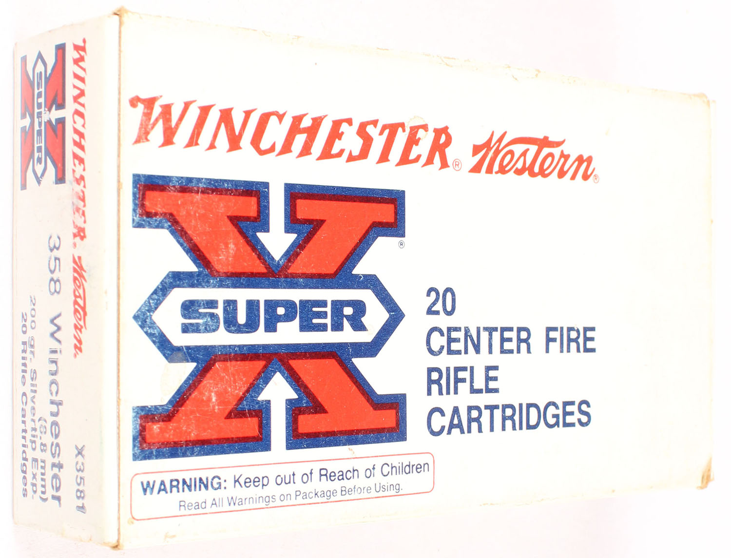 Winchester, Super X, .358 Winchester (8.8mm), 200 Grain Silvertip Expanding, Full, 1pc. White red & black box, box is solid with excellent color, minor age soiling & corner wear, edges are mostly crisp, end flaps are solid, ammo is excellent. Grade: Excellent - Value: 20 to 60