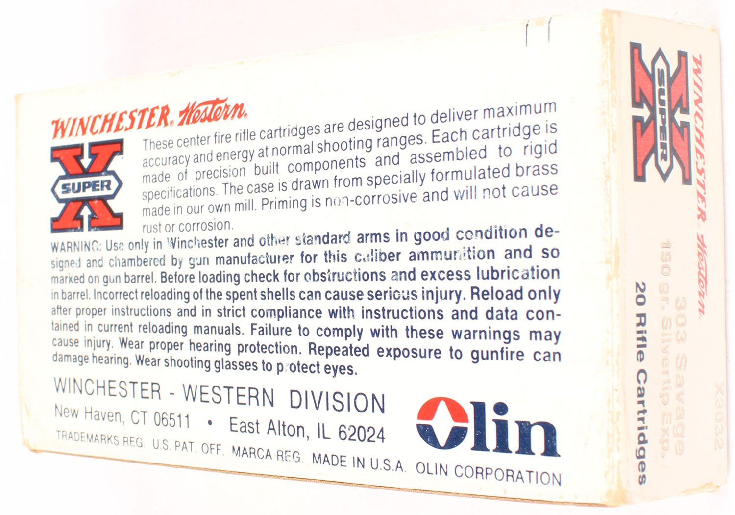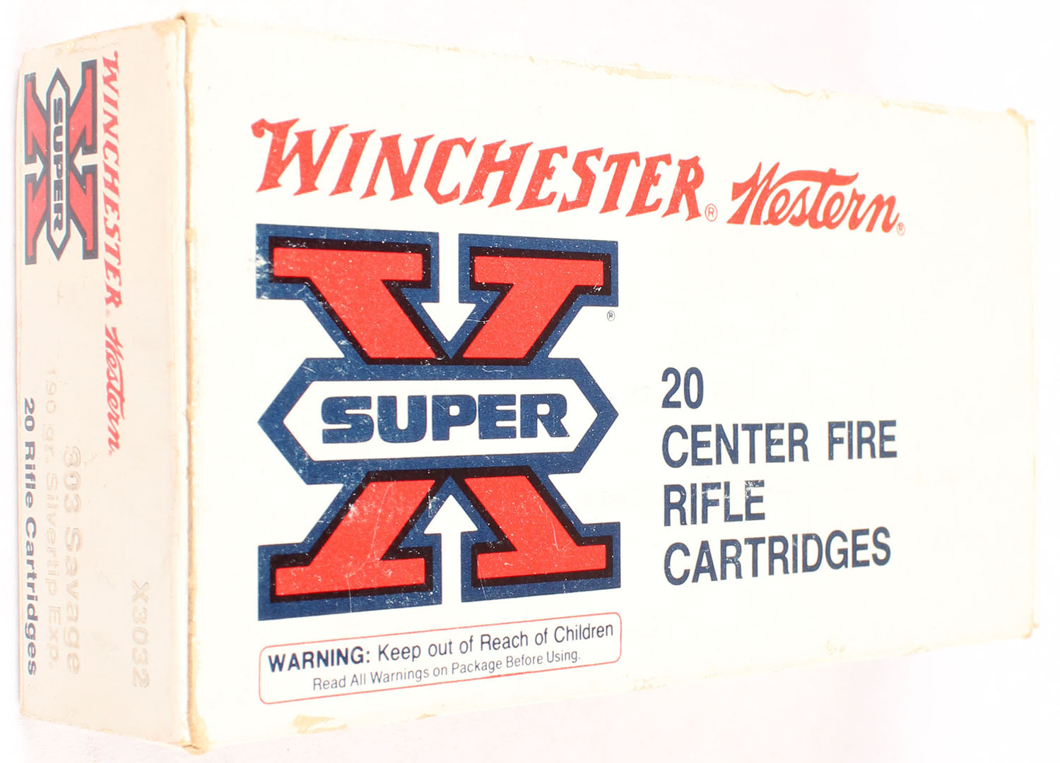 Winchester, Super X, .303 Savage, 190 Grain Silvertip Expanding, Full, 1pc. White red & black box, box is solid with excellent color, very minor age soiling, very minor edge & corner wear, end flaps are solid, ammo is excellent. Grade: Excellent - Value: 20 to 60