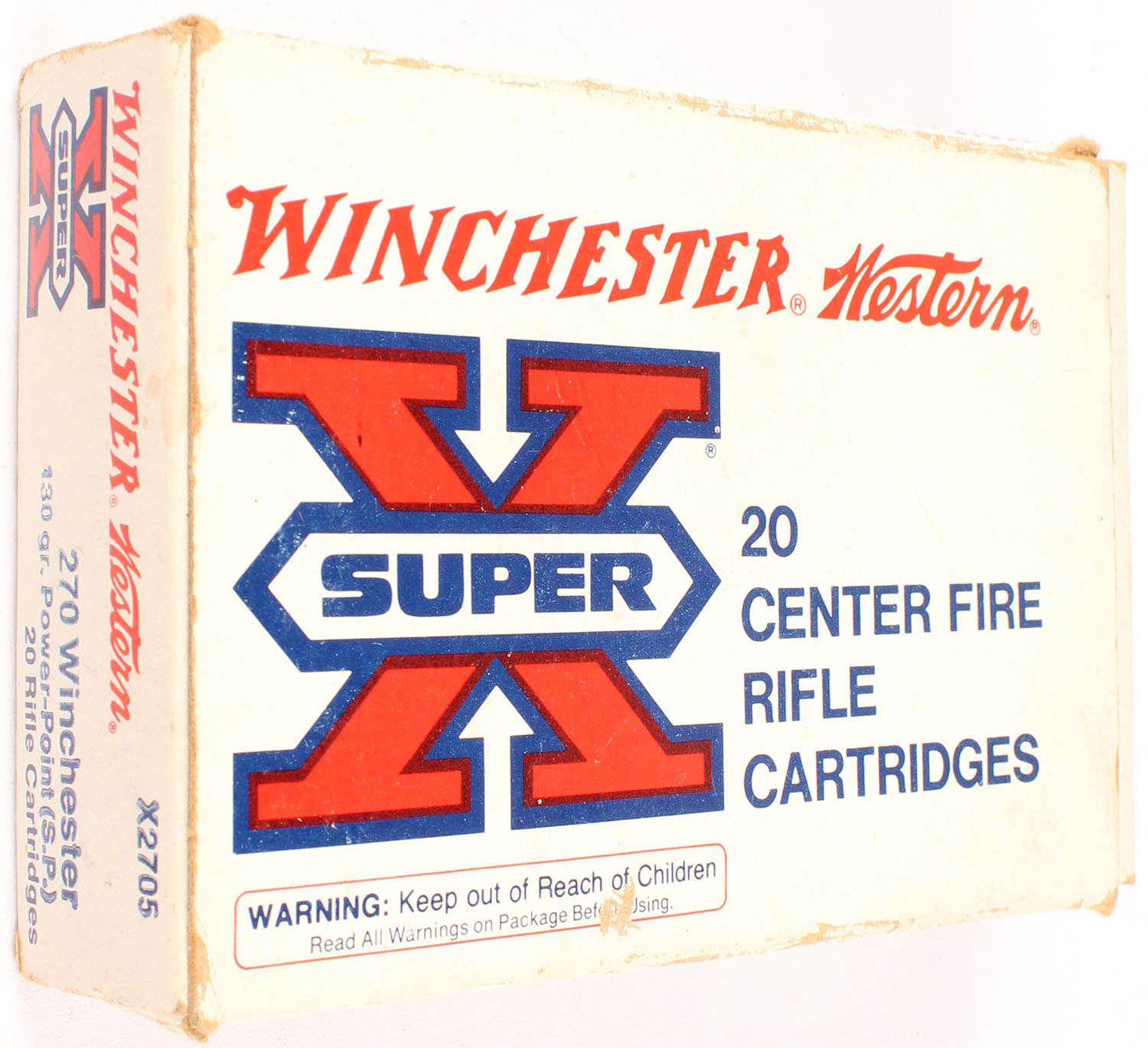 Winchester, Super X, .270 Winchester, 130 Grain Power-Point, Full, 1pc. White red & black box, box is solid with very good to excellent color, some age soiling, minor shelf wear, corner wear, some edge wear, end flaps are solid, ammo is excellent. Grade: Very Good ++ - Value: 20 to 60