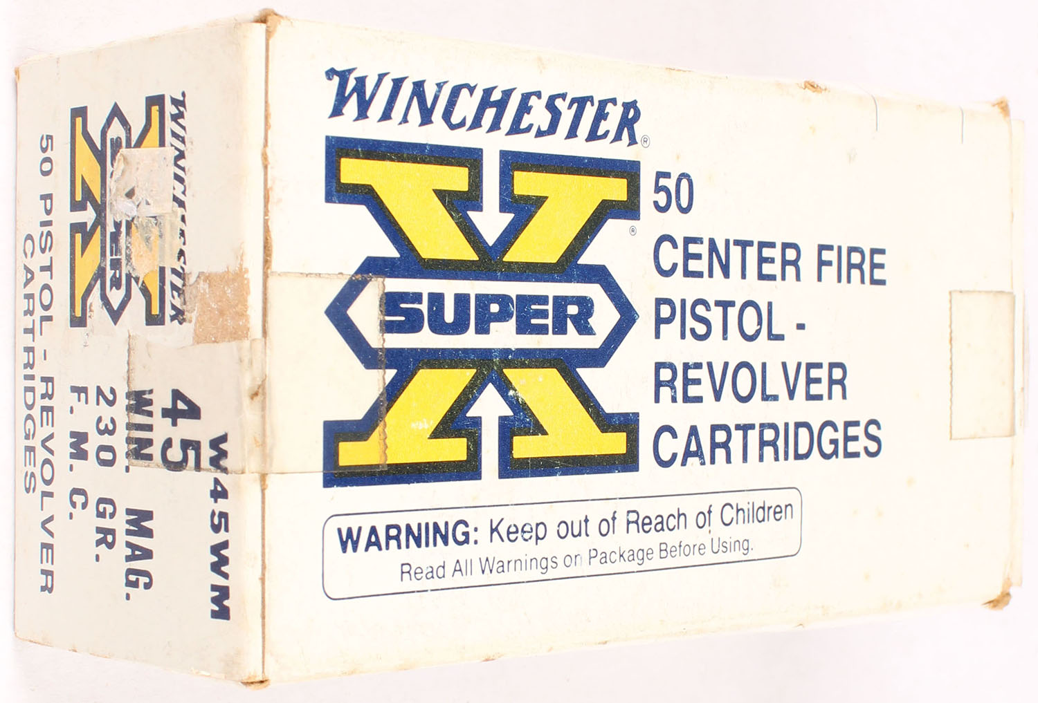 Winchester, Super X, .45 Winchester Magnum, 230 Grain Full Metal Case, Full, 1pc. White orange & blue box, box is solid with excellent color, minor age soiling & corner wear, very minor edge wear, end flaps are solid, tape on both ends, ammo is excellent. Grade: Very Good ++ - Value: 50 to 150