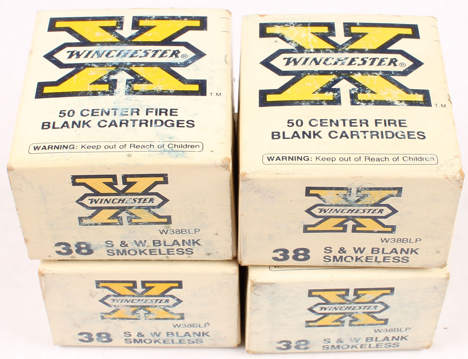 Winchester, Lot of (4) X, .38 Smith & Wesson Blank Cartridges, Smokeless, all boxes full, very good color with shelf wear & minor corner wear, ammo is excellent. Grade: Excellent - Value: 24 to 100