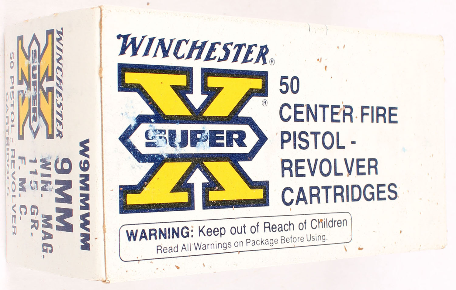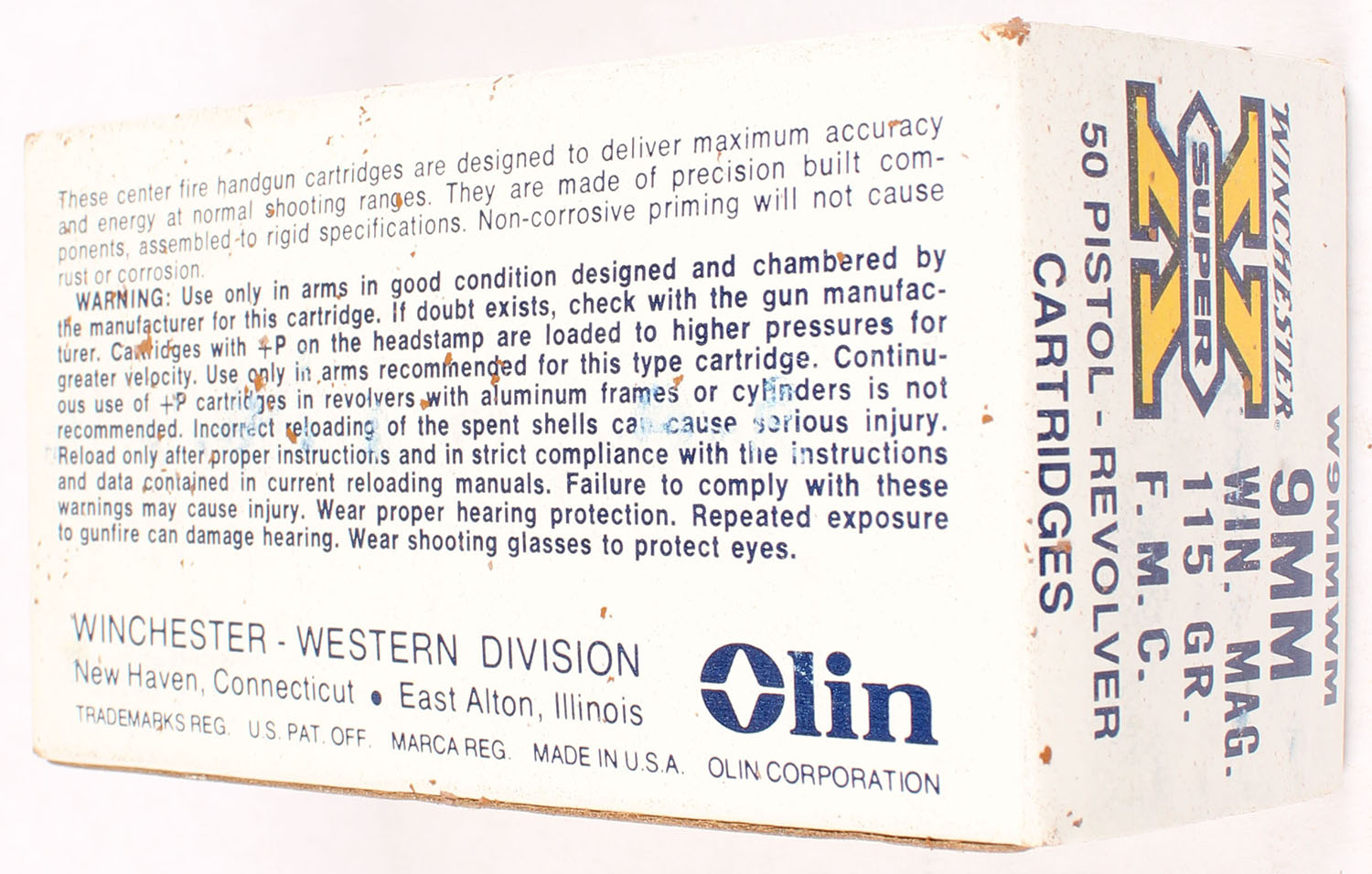 Winchester, Super X, 9mm Winchester Magnum, 115 Grain Full Metal Case, Full, 1pc. White orange & black box, box is solid with excellent color, very minor age soiling & shelf wear, corners are mostly sharp, edges are crisp, end flaps are solid, ammo is excellent. Grade: Excellent - Value: 10 to 50