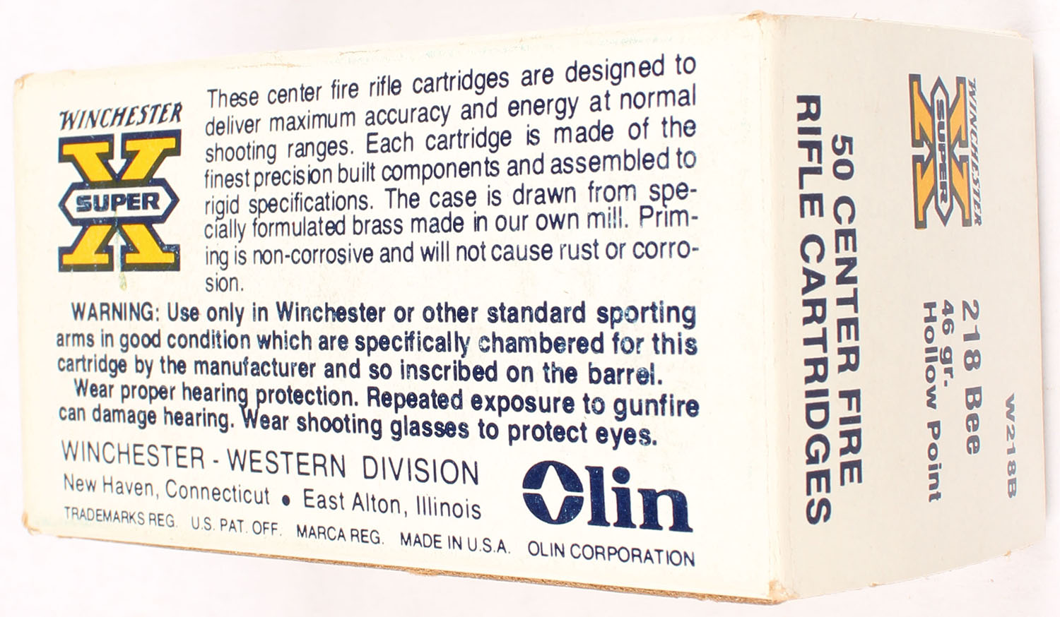 Winchester, Super X, .218 Bee, 46 Grain Hollow Point, Partial 47rds., 1pc. White orange & black box, box is solid with excellent color, scuff on top, very minor corner wear, edges are crisp, end flaps are solid, ammo is excellent. Grade: Very Good ++ - Value: 20 to 80