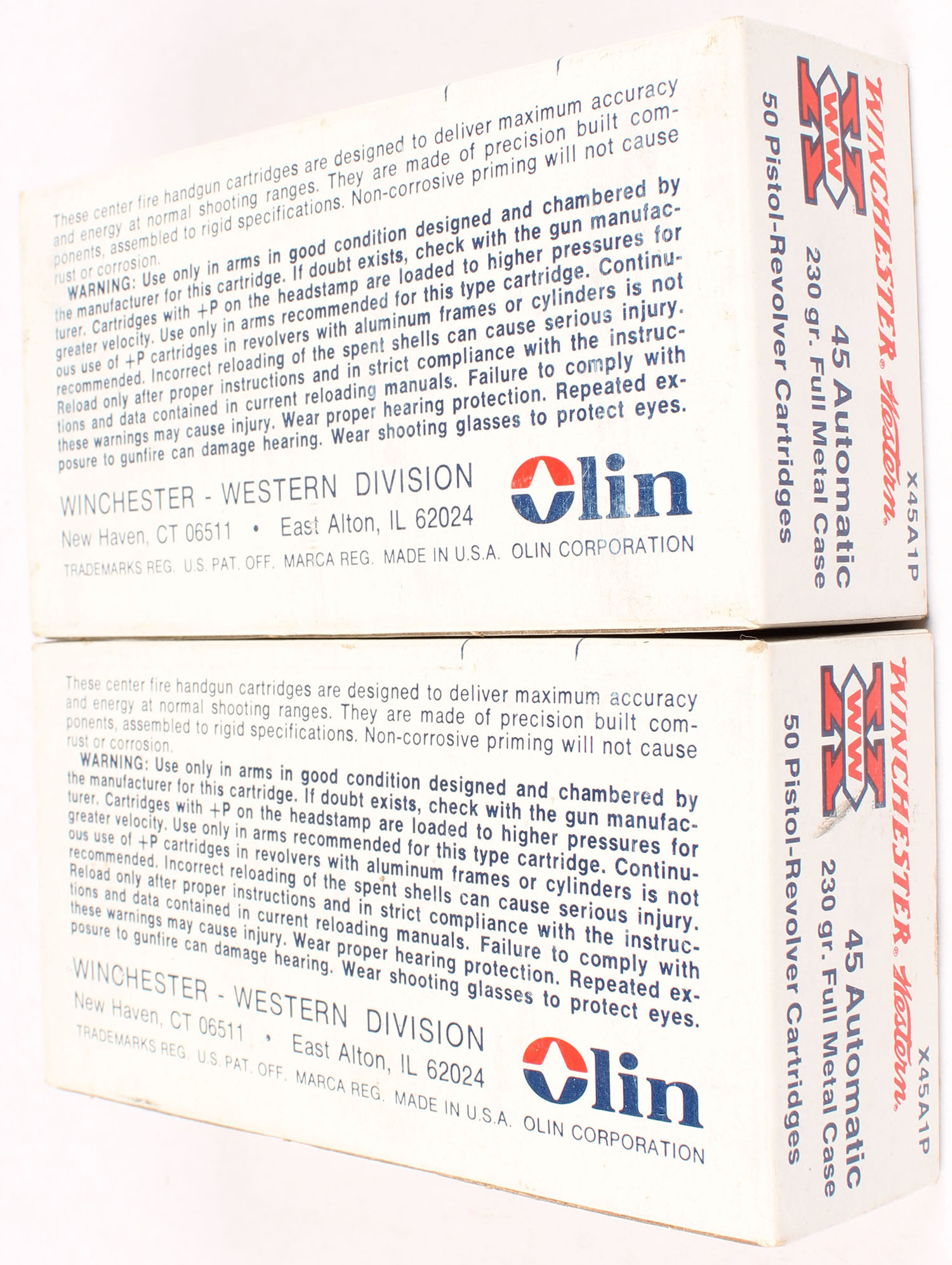 Winchester, Lot of (2), X, .45 Automatic, 230 Grain Full Metal Case, both boxes full with excellent color, some age soiling, corners are sharp, edges are crisp, end flaps are solid, ammo is minty. Grade: Excellent - Value: 30 to 90