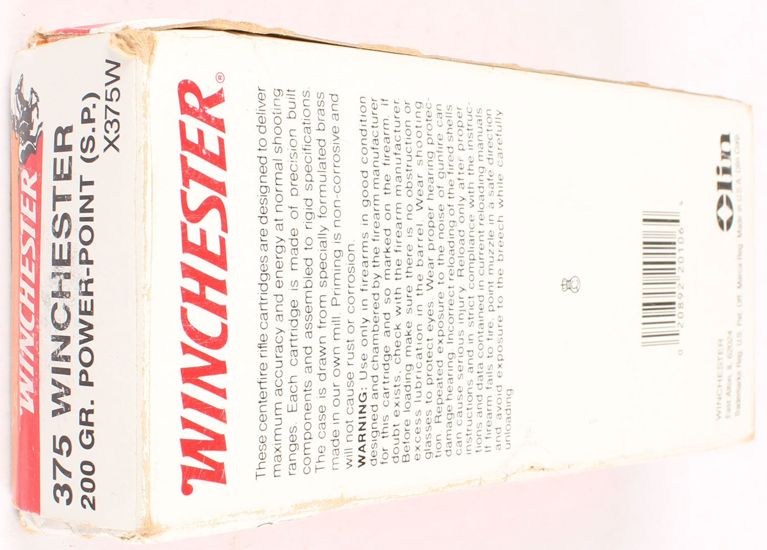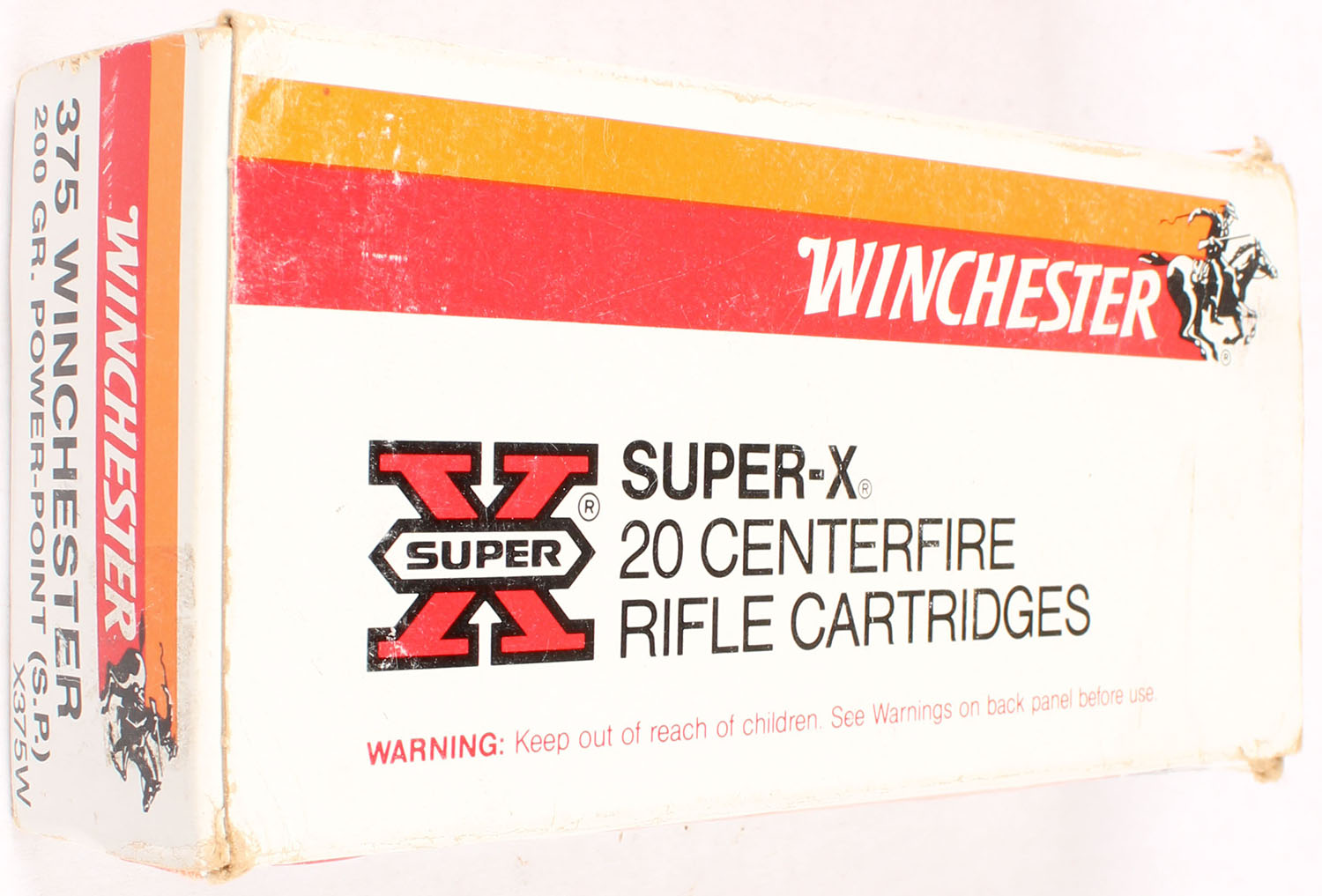 Winchester, Super-X, .375 Winchester, 200 Grain Power-Point, Full, 1pc. White red & orange box, box is solid with excellent color, minor shelf wear, corner wear, minor edge wear, end flaps are solid, ammo is minty. Grade: Excellent - Value: 50 to 150