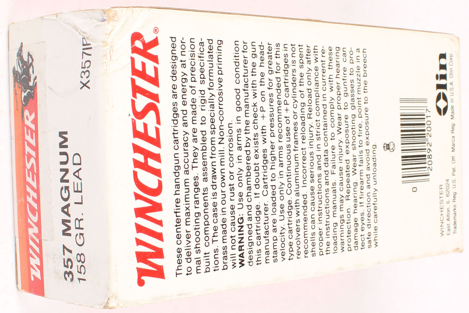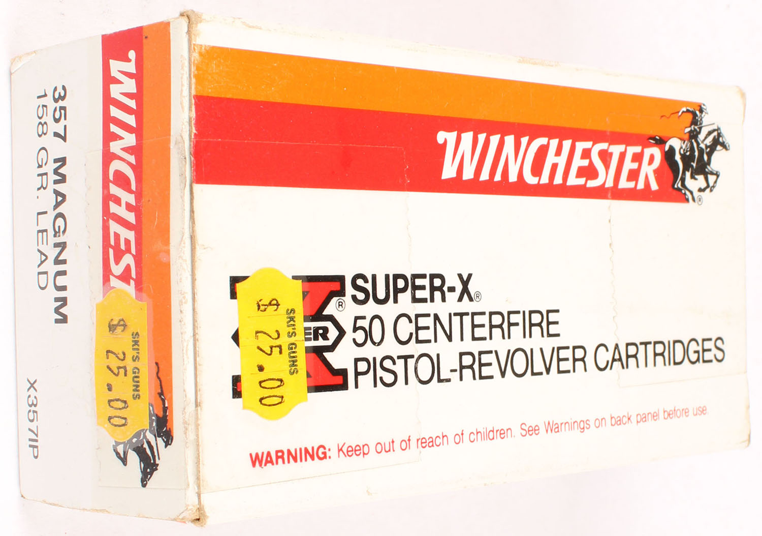 Winchester, Super-X, .357 Magnum, 158 Grain Lead, Full, 1pc. White red * orange box, box is solid with minty color, tape on both ends, very minor edge & corner wear, end flaps are solid, ammo is minty. Grade: Excellent - Value: 20 to 60