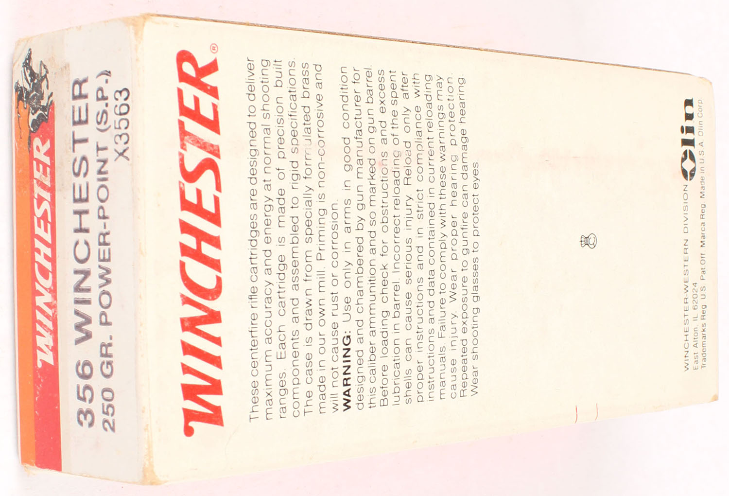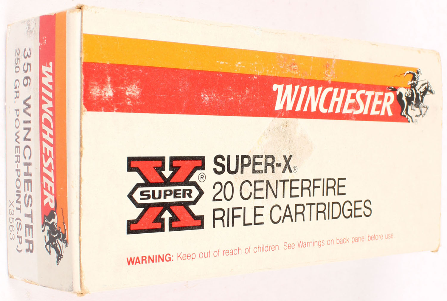 Winchester, Super-X, .356 Winchester, 250 Grain Power-Point, Full, 1pc. White red & orange box, box is solid with very good to excellent color, very minor age soiling & shelf wear, stain on top, minor corner wear, edges are mostly crisp, end flaps are solid, ammo is excellent. Grade: Excellent - Value: 20 to 60