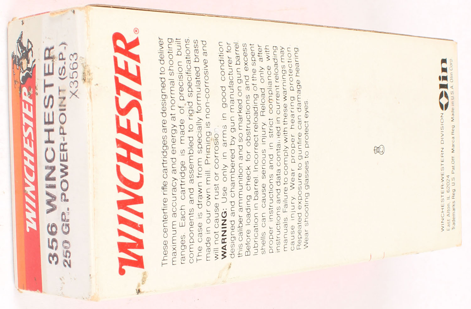 Winchester, Super-X, .356 Winchester, 250 Grain Power-Point, Full, 1pc. White red & orange box, box is solid with very good to excellent color, very minor age soiling & shelf wear, top has been written on, minor corner wear, edges are mostly crisp, end flaps are solid, ammo is excellent. Grade: Excellent - Value: 20 to 60