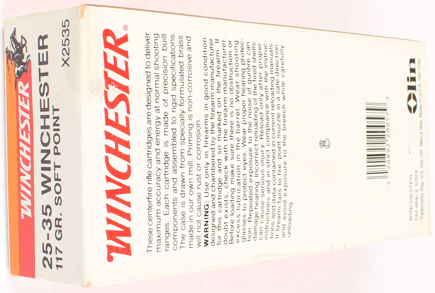 Winchester, Super X, .25-35 Winchester, 117 Grain Soft Point, Full, 1pc. White red & orange box, box is solid with excellent color, some staining on top, corners are mostly sharp, edges are mostly crisp, end flaps are solid, ammo is excellent. Grade: Excellent - Value: 40 to 120